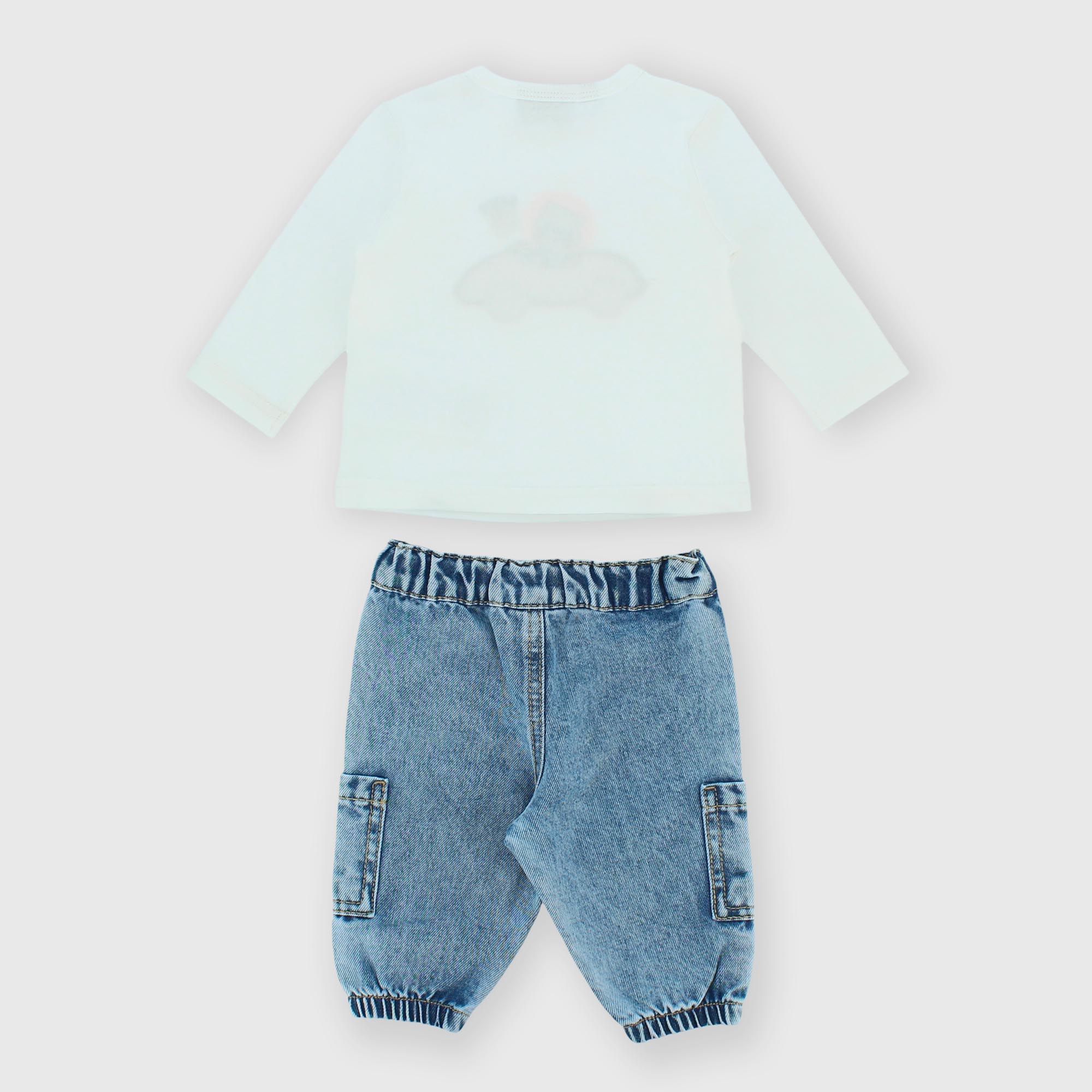 Набор состоящий из двух штук. Футболка из джерси, круглый вырез, длинные рукава. Застежка на кнопки на плече. Аппликация и вышивка спереди. Джинсовые брюки с эластичной талией и пуговицей. Боковые накладные карманы. Эластичный низ