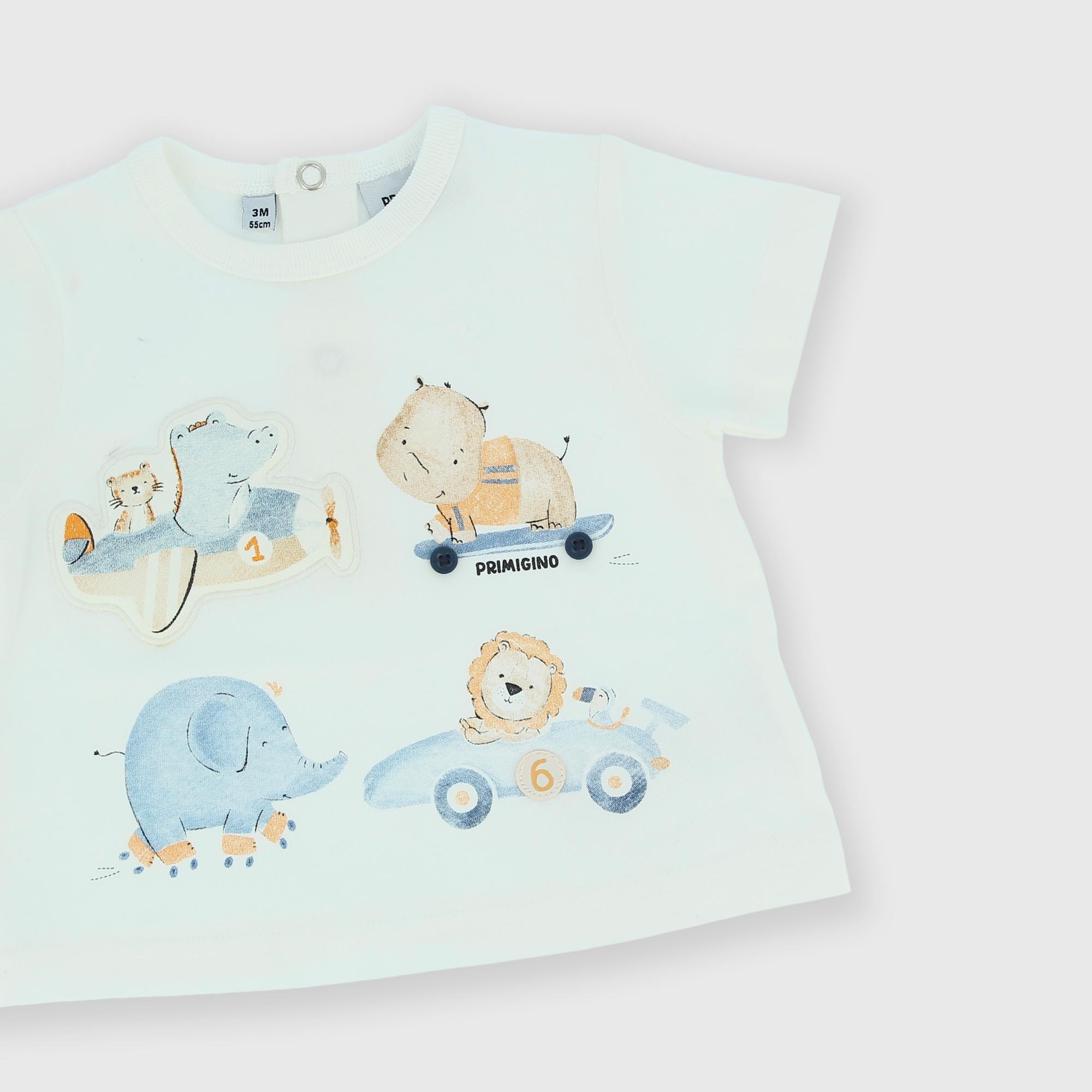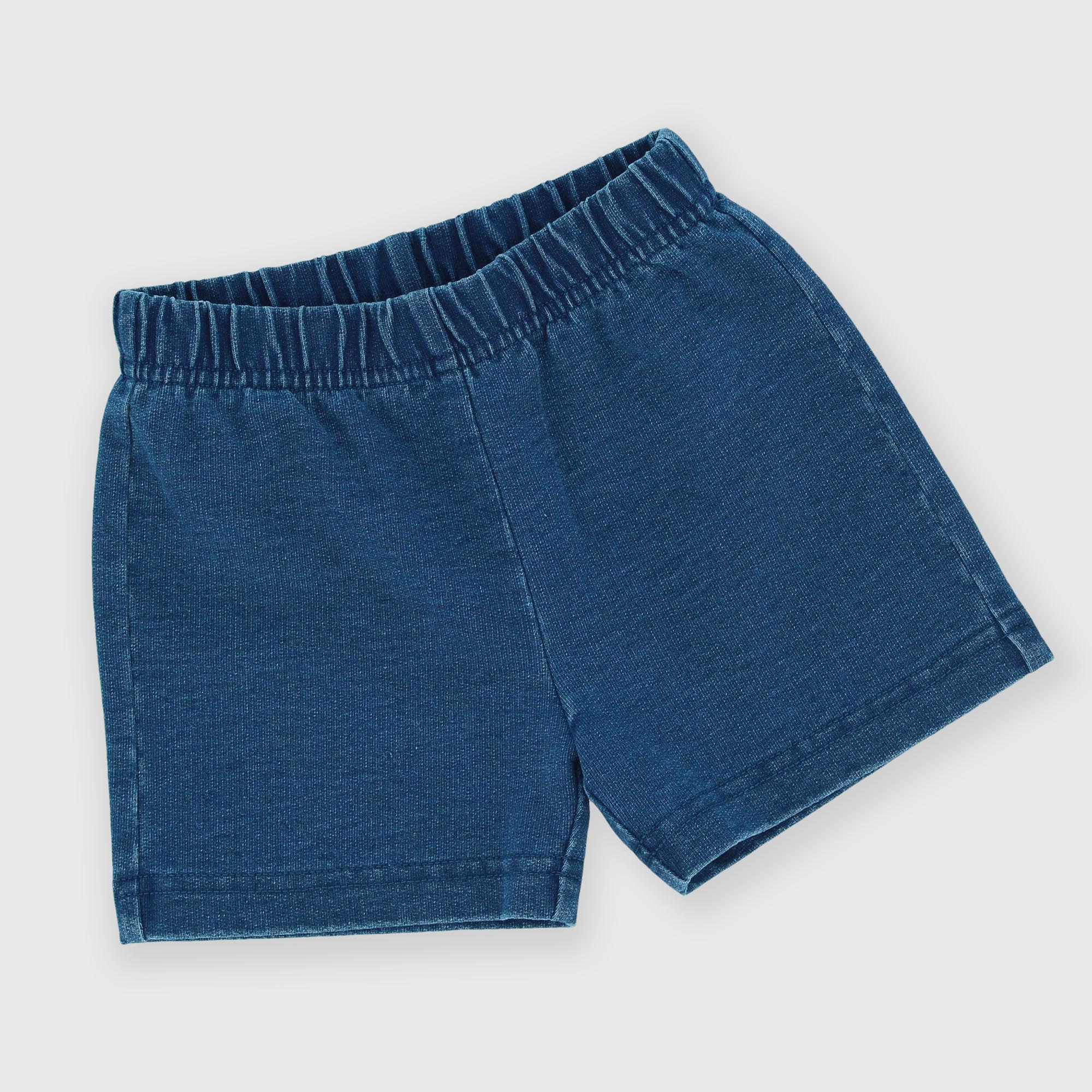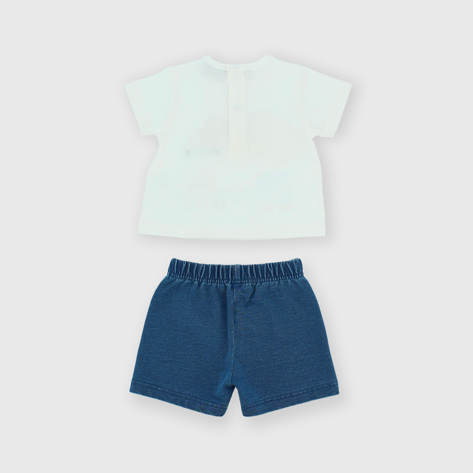 Набор состоящий из двух штук. Футболка из джерси с круглым вырезом и короткими рукавами. Застежка на кнопки сзади. Нашивки и принты спереди. Трикотажные джинсовые шорты с резинкой на талии.