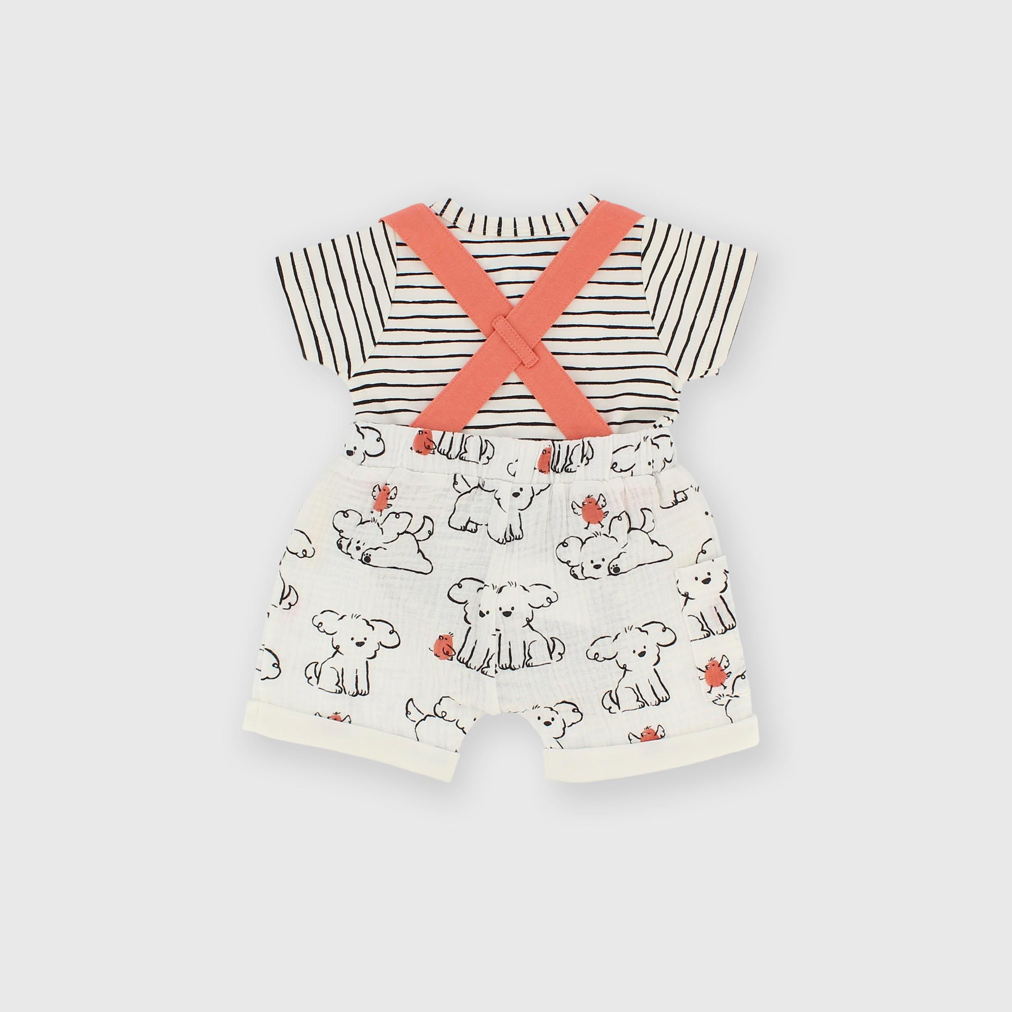 Комплект из двух предметов. Боди из интерлока с короткими рукавами. Напечатанные полоски и пуговицы спереди. Газовые шорты-бермуды с подтяжками. Эластичный пояс. Анималистичный принт по всей поверхности.