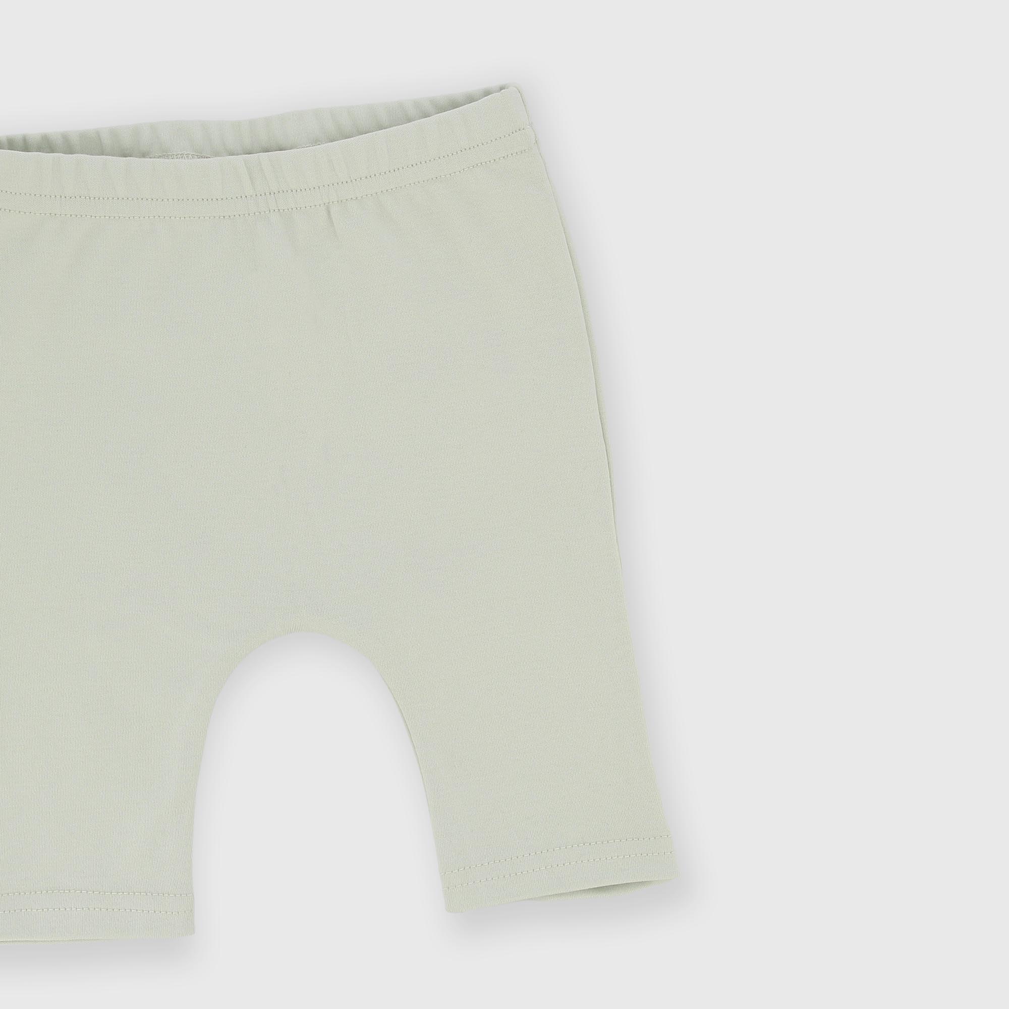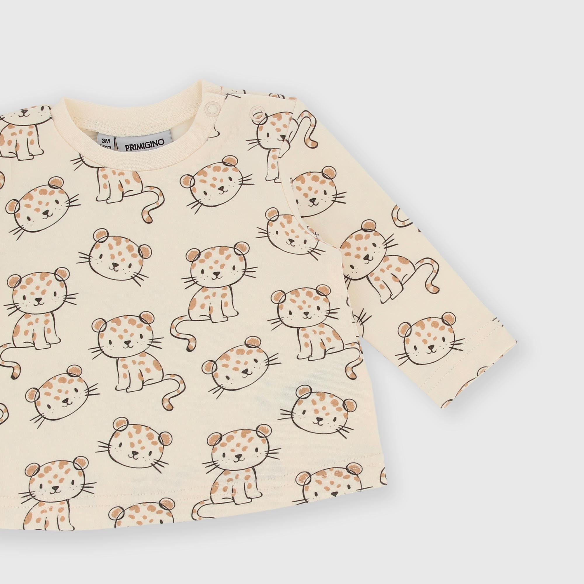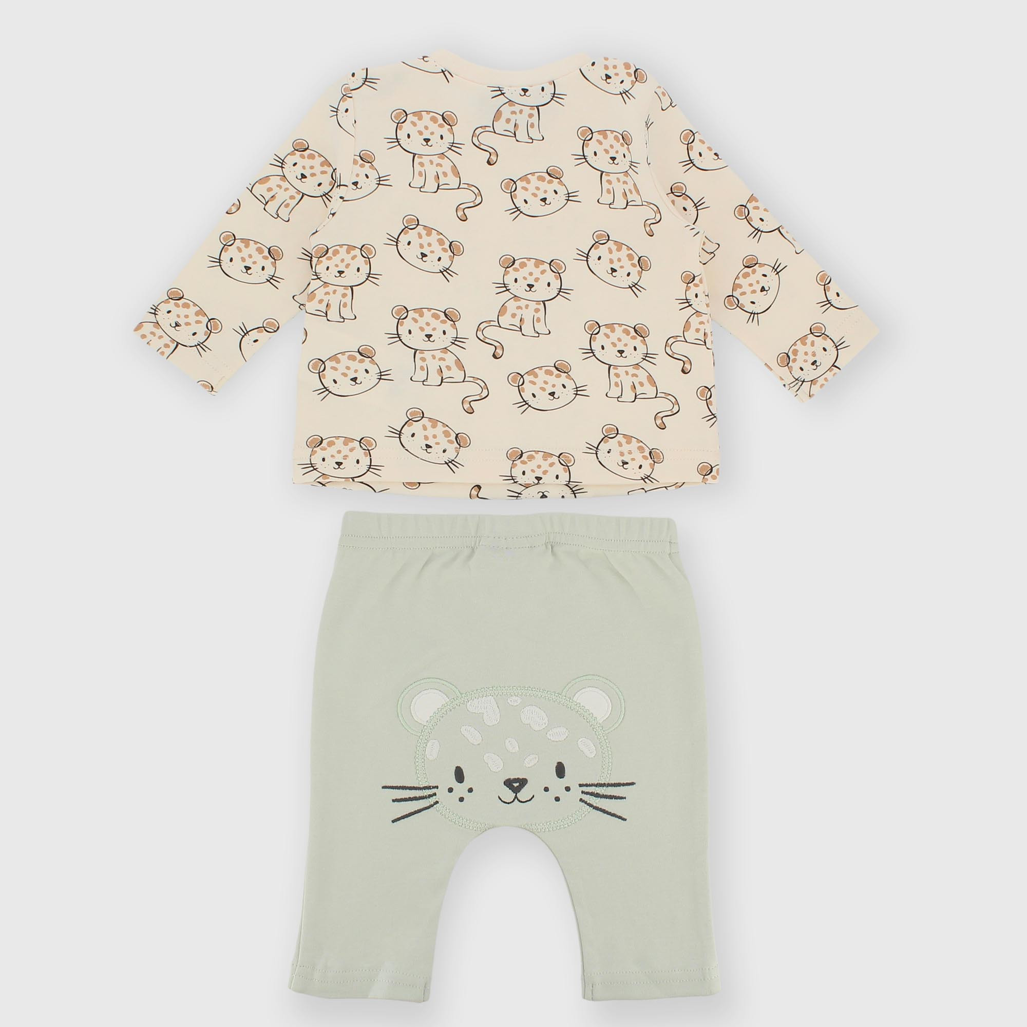 Костюм-двойка из ткани интерлок. Футболка с круглым вырезом и длинными рукавами. Застёжка на кнопки на плече. Леопардовый принт по всей поверхности. Брюки на резинке. Вышивка с леопардовым принтом на спине.