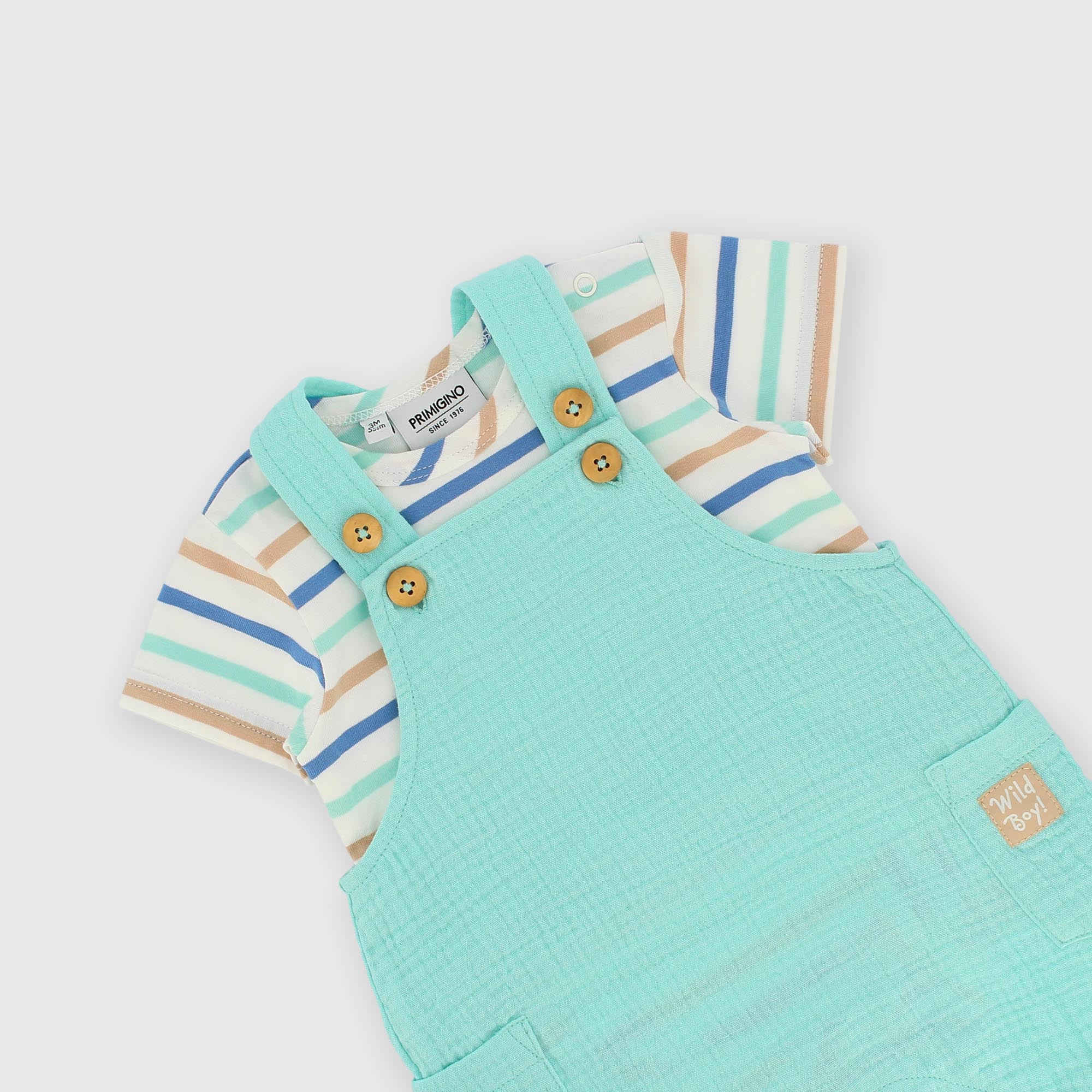 Комплект из двух предметов. Трикотажное боди с полосками, окрашенными пряжей, круглым вырезом и короткими рукавами. Застёжка на кнопки на плече. Комбинезон из хлопчатобумажной ткани. Застёжка на кнопки в промежности. Боковые накладные карманы с этикеткой.