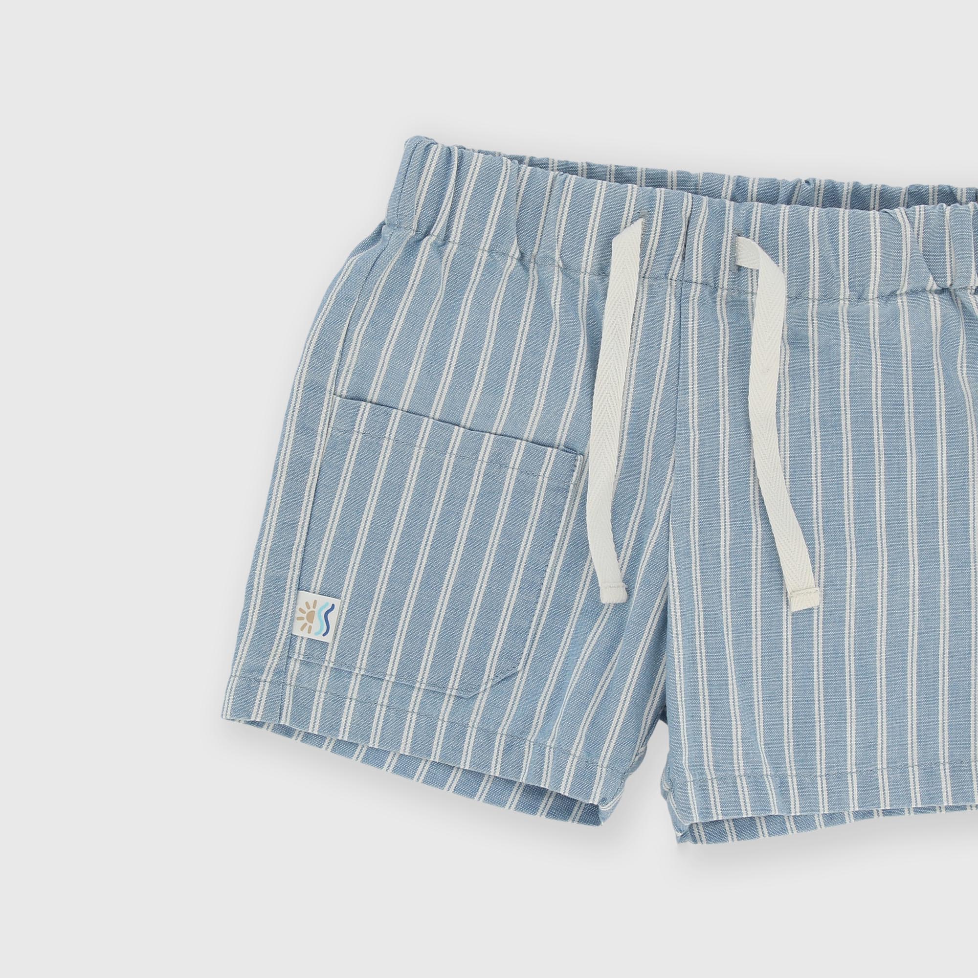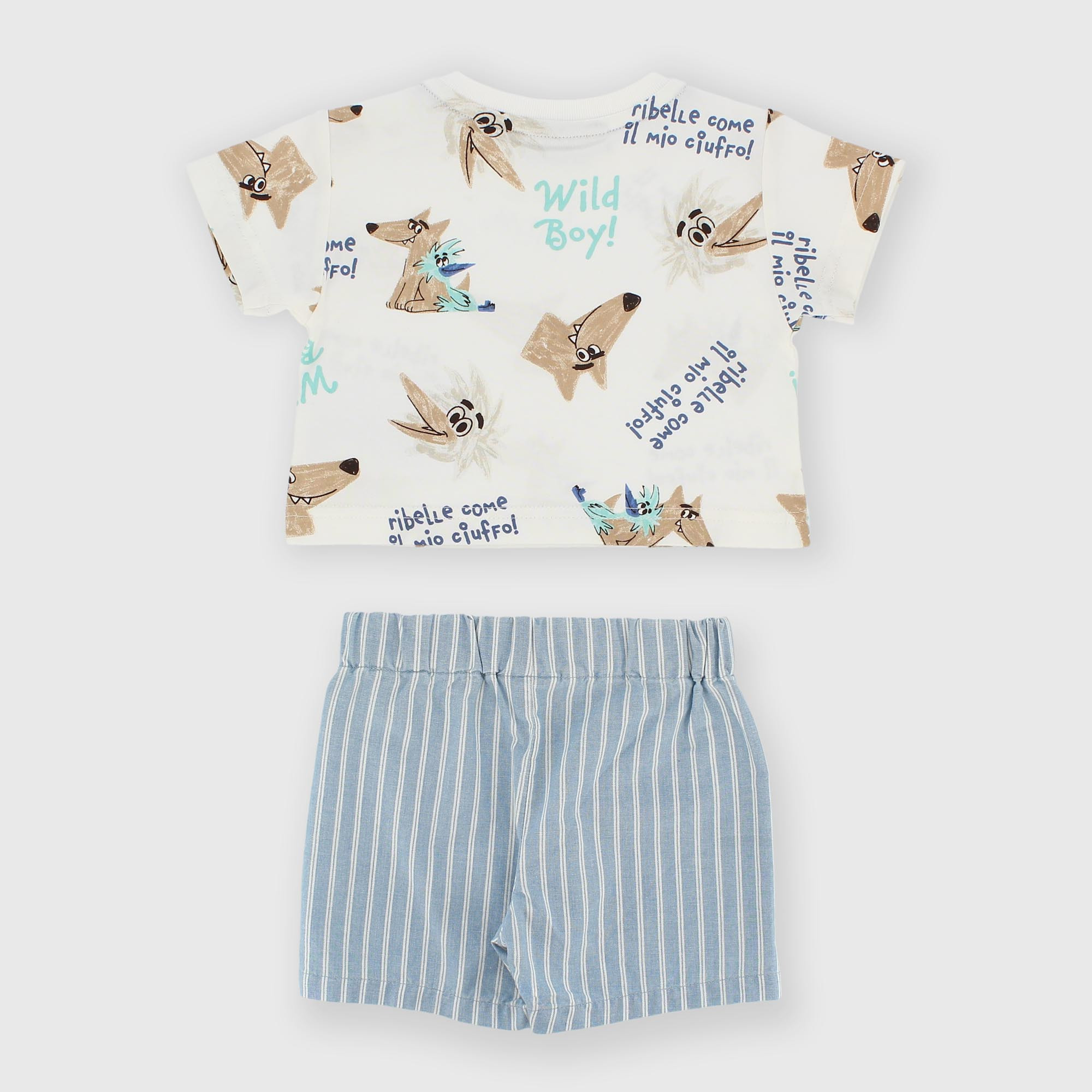 Комплект из двух предметов. Футболка из джерси с круглым вырезом и короткими рукавами. Застёжка на кнопки на плече. Сплошной принт. Шорты из окрашенной пряжей полосатой ткани шамбре с эластичным поясом и завязками спереди. Накладной карман.