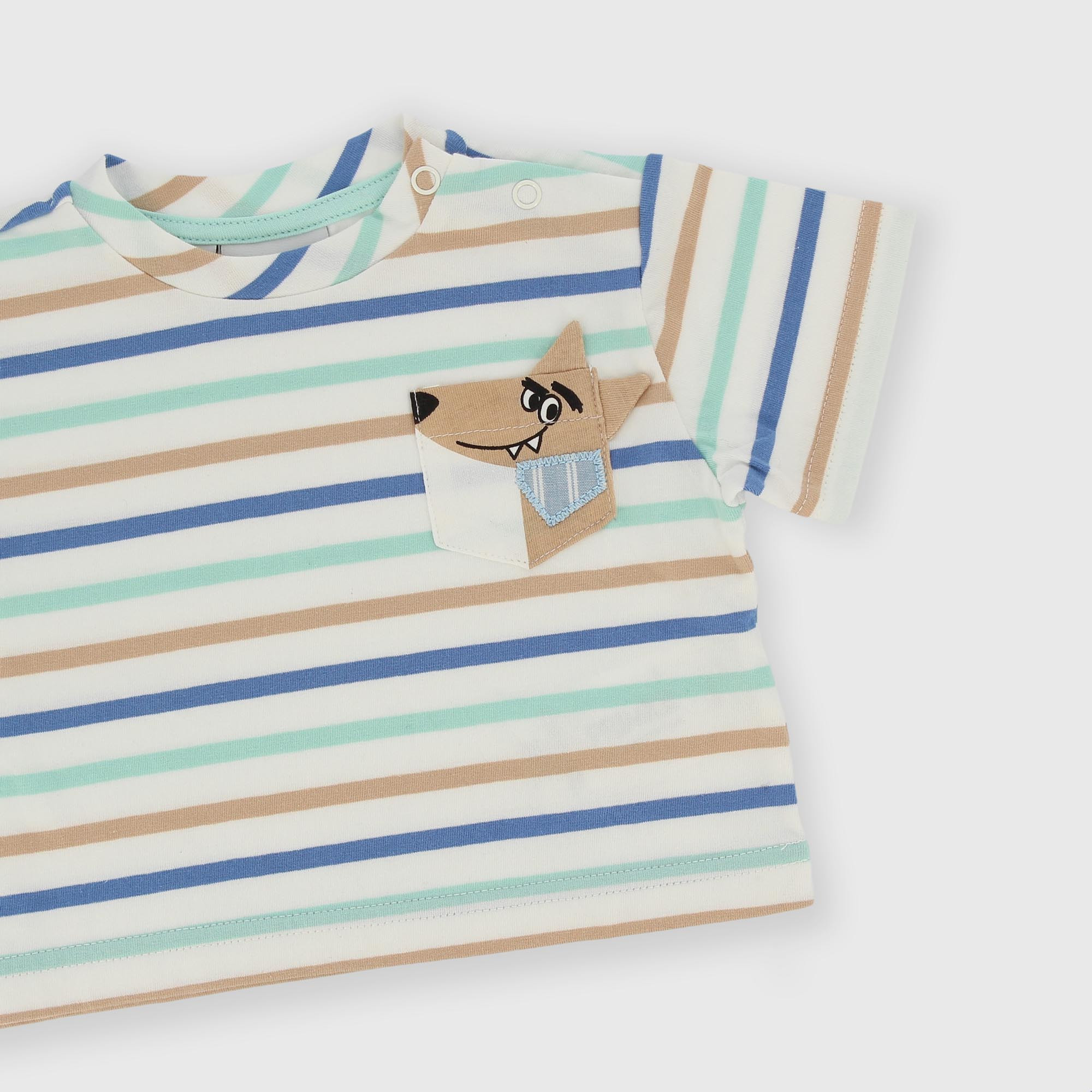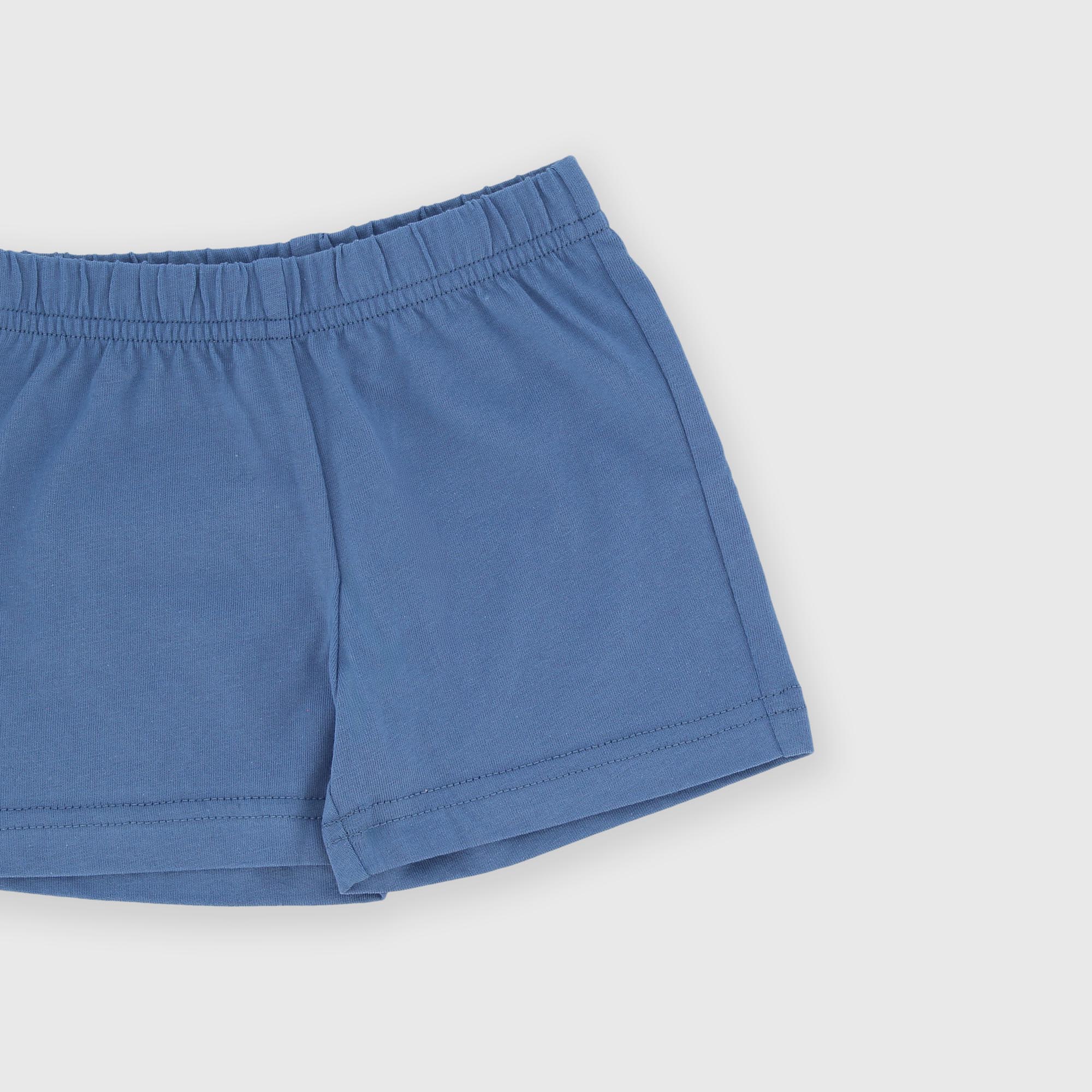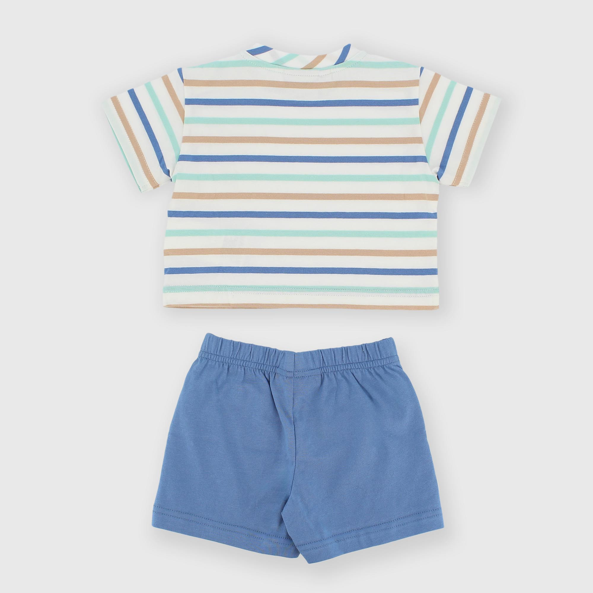 Комплект из двух предметов: трикотажная футболка с круглым вырезом, короткими рукавами, окрашенная пряжей, в полоску. Застёжка на кнопку на плече. Нагрудный карман-ложка. Шорты на резинке на талии.
