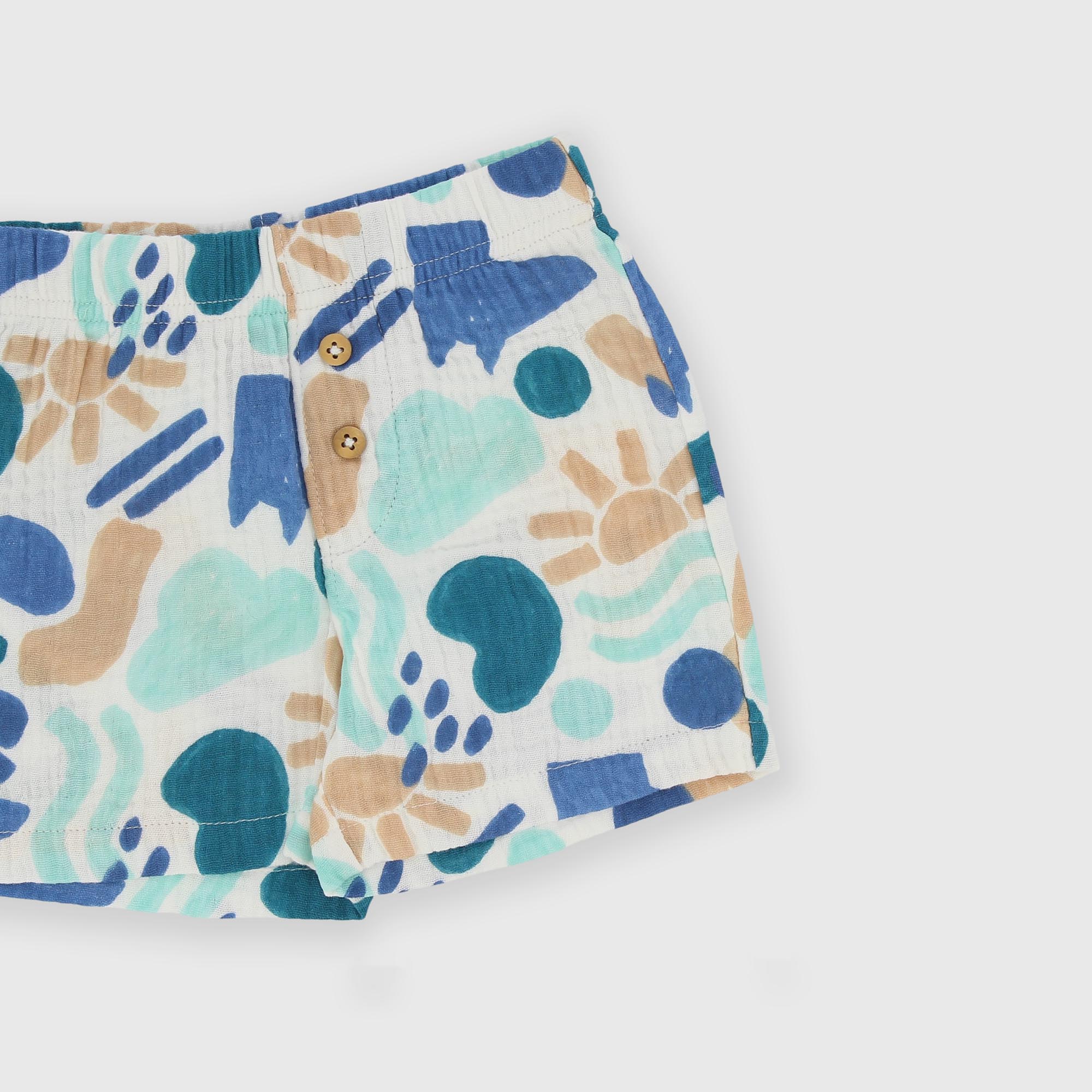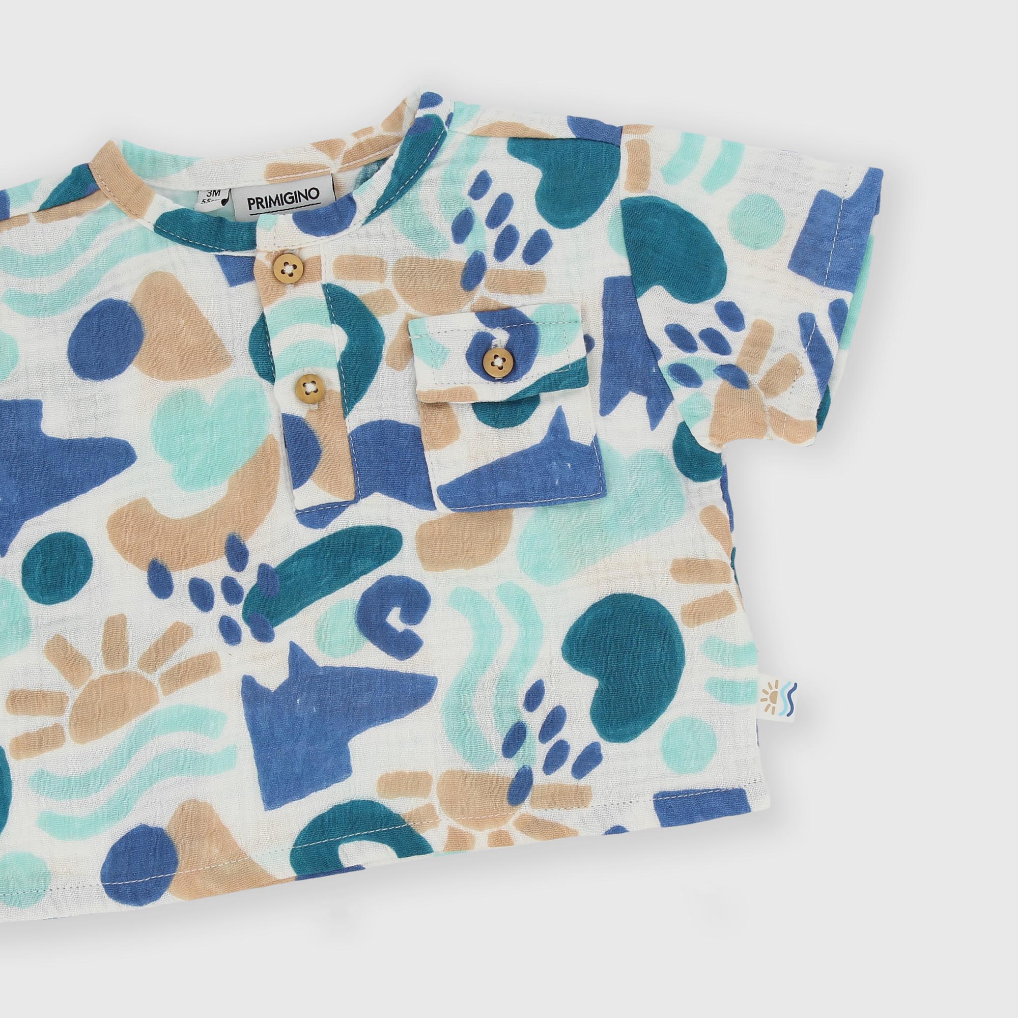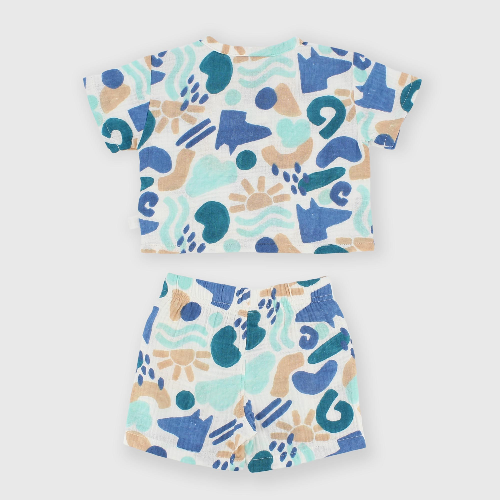 Костюм-двойка из хлопчатобумажной ткани. Сплошной принт. Рубашка с короткими рукавами. Нагрудный карман с клапаном. Эластичный пояс на пуговицах.