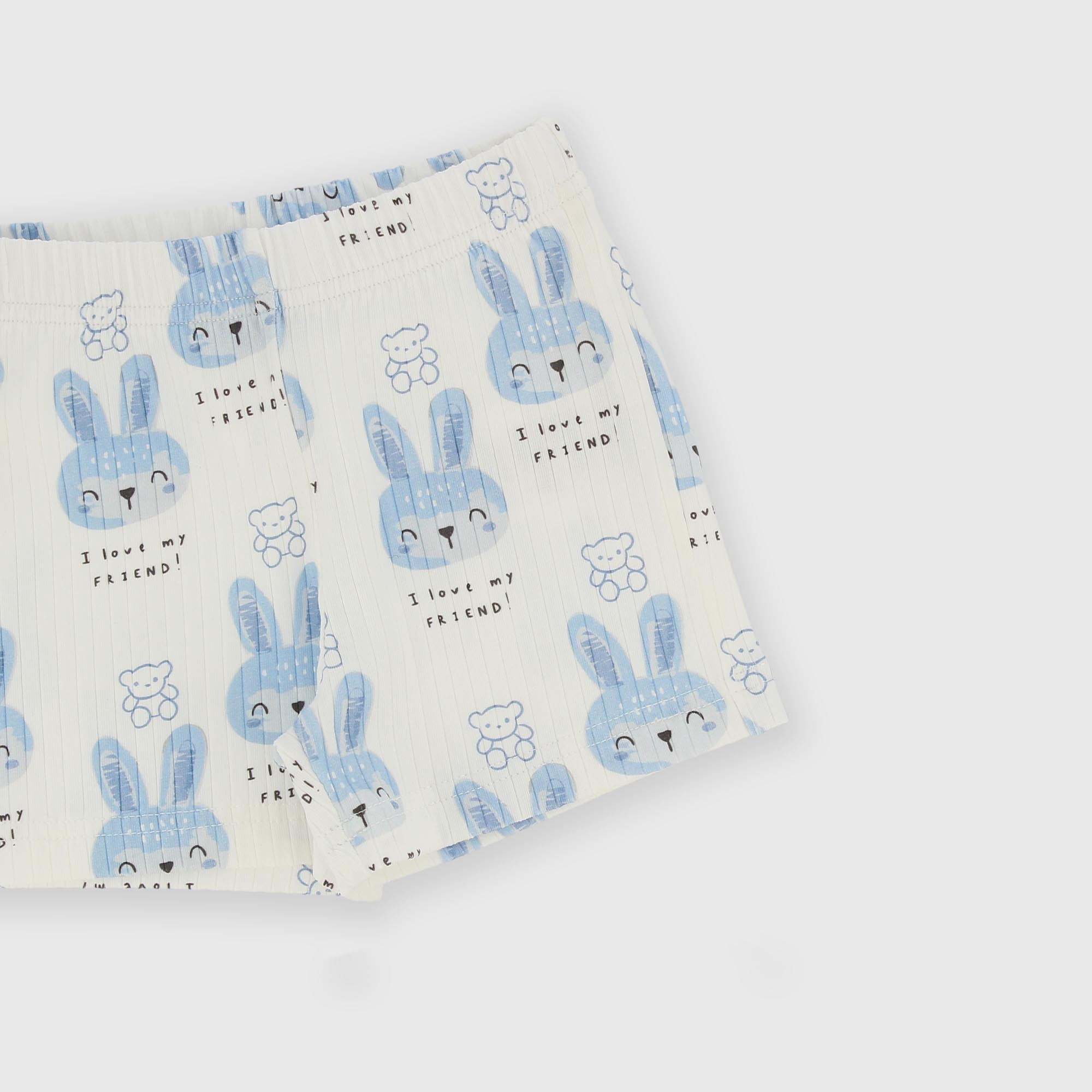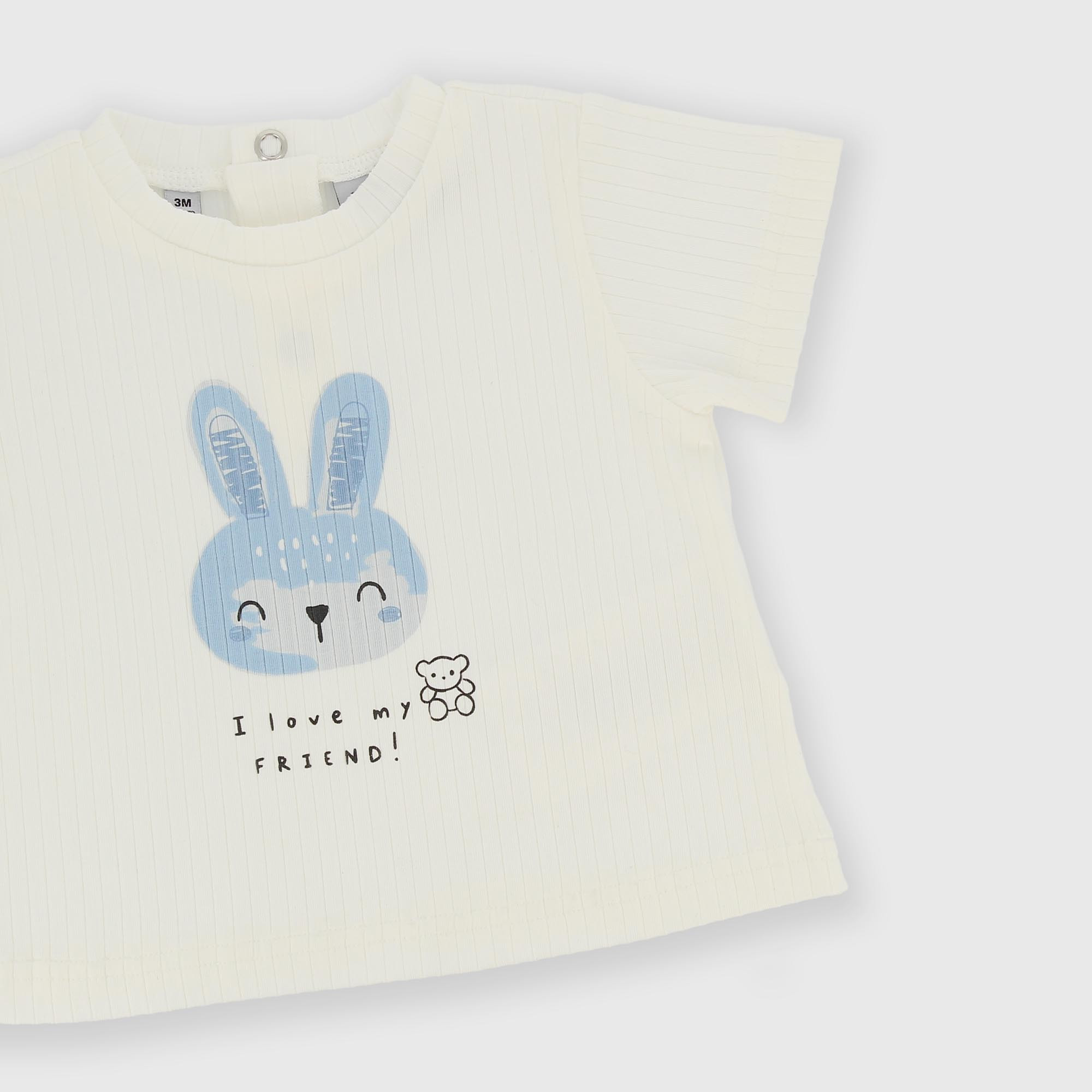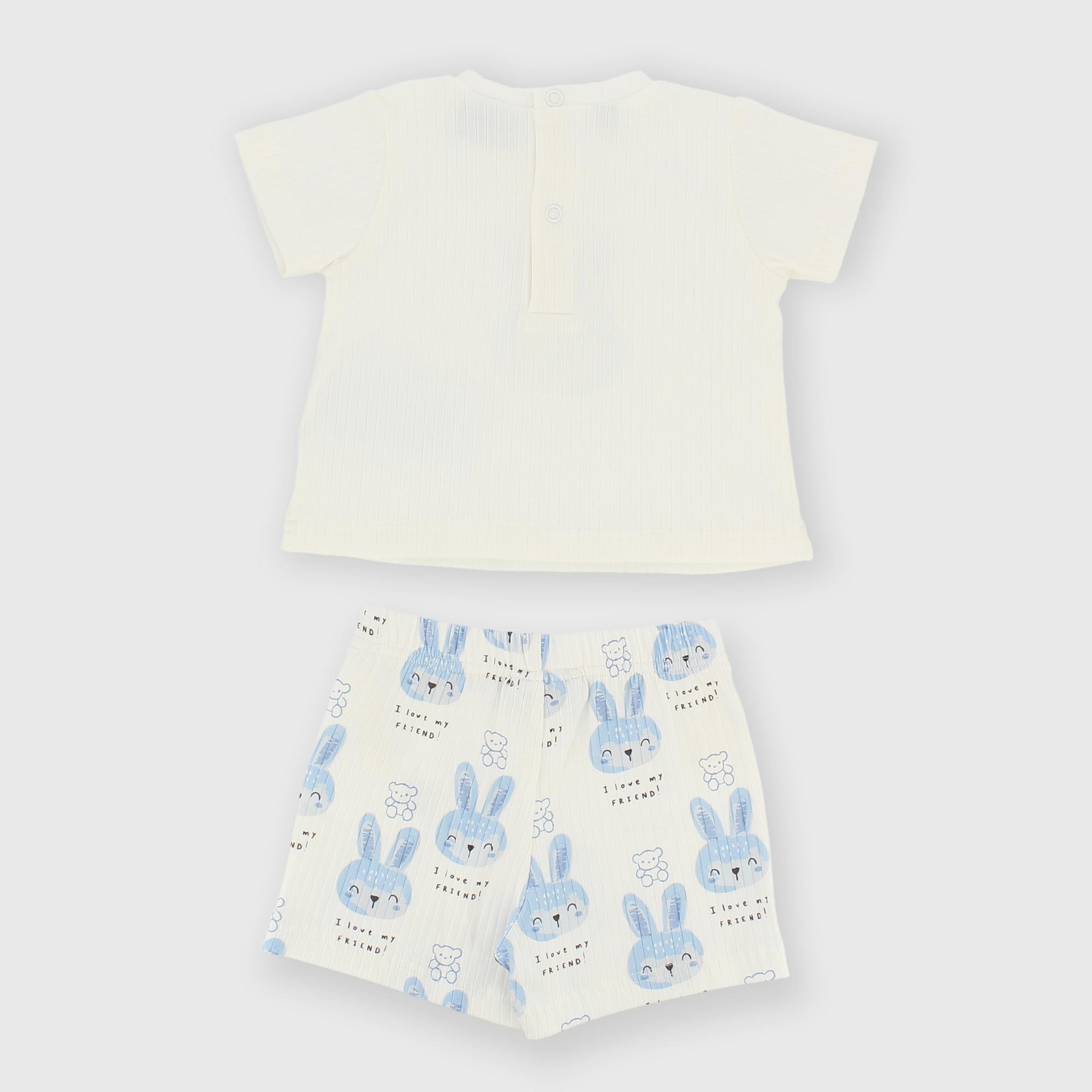 Комплект из двух предметов в рубчик. Круглый вырез горловины, короткие рукава. Застёжка на кнопки сзади. Принт с изображением кролика спереди. Шорты на резинке. Принт с изображением кролика по всей поверхности.