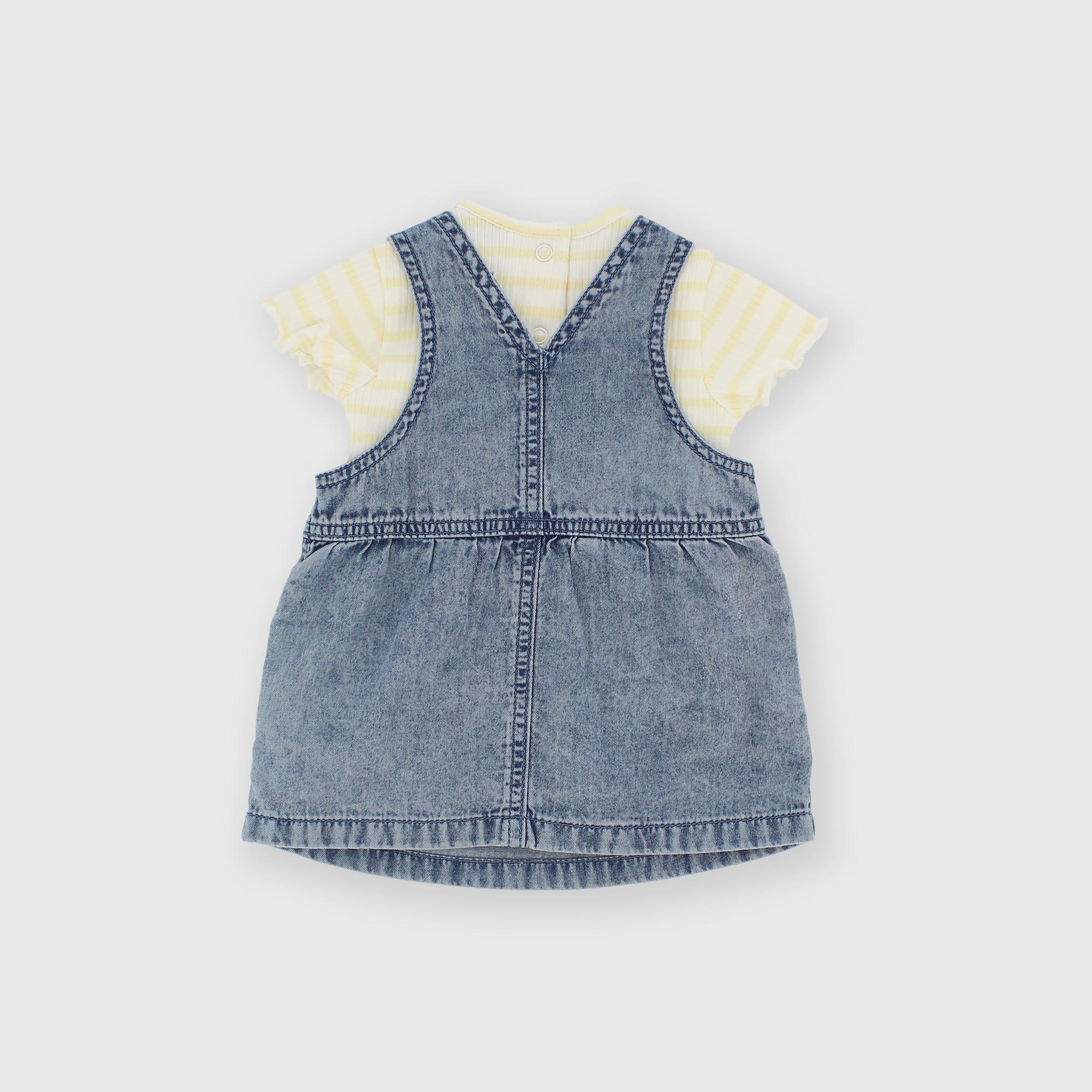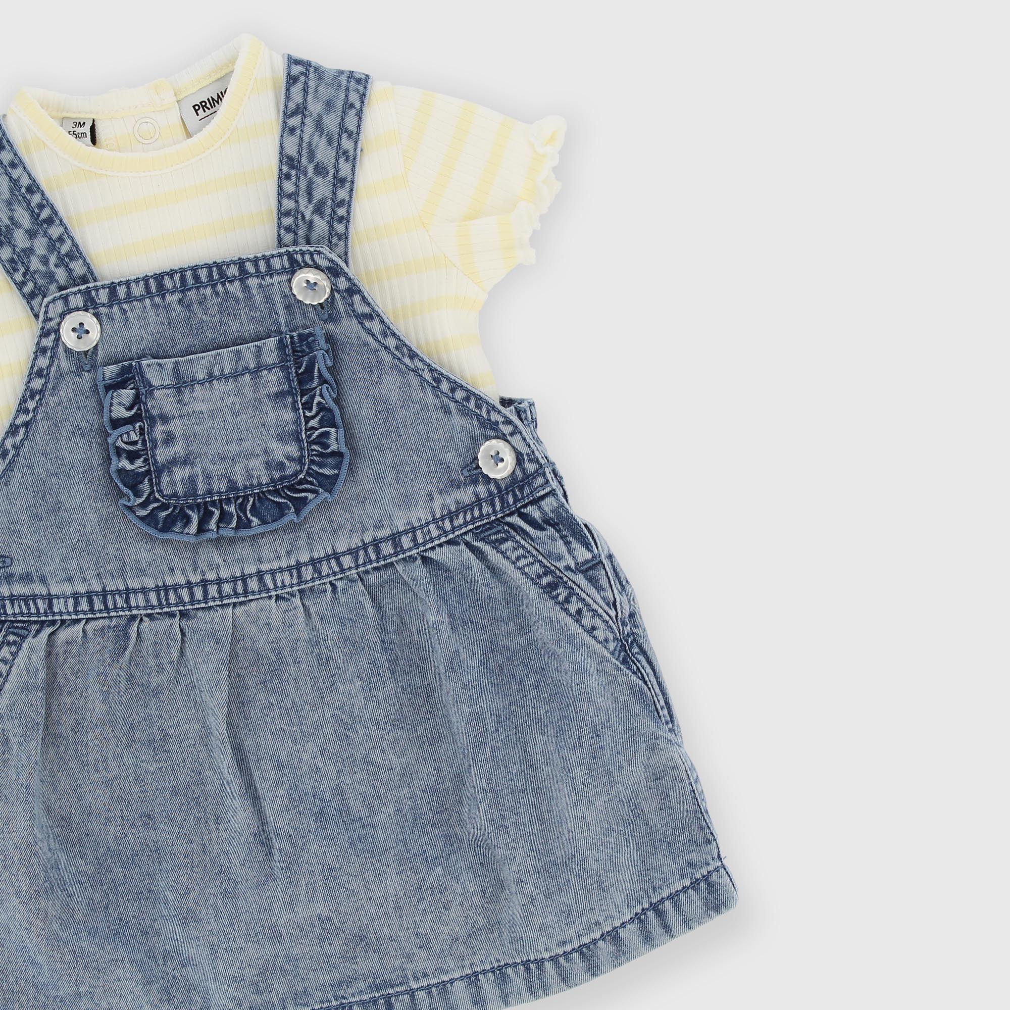 Комплект из двух предметов. Боди в полоску с короткими рукавами и ребристым узором. Застёжка на кнопку сзади. Джинсовый комбинезон с накладным карманом спереди.