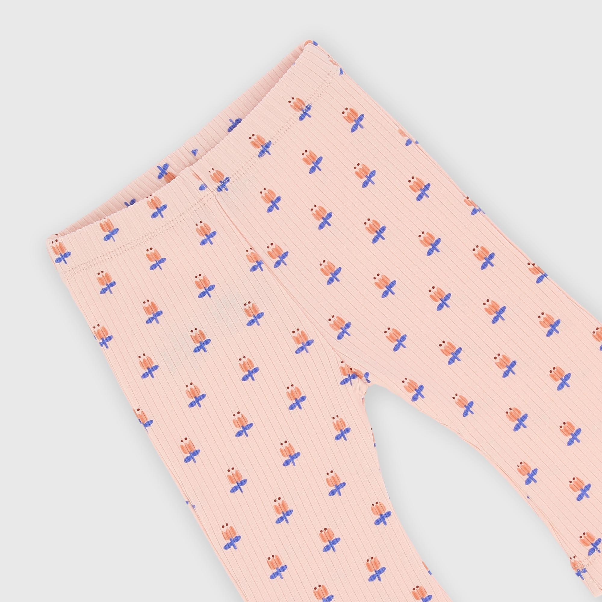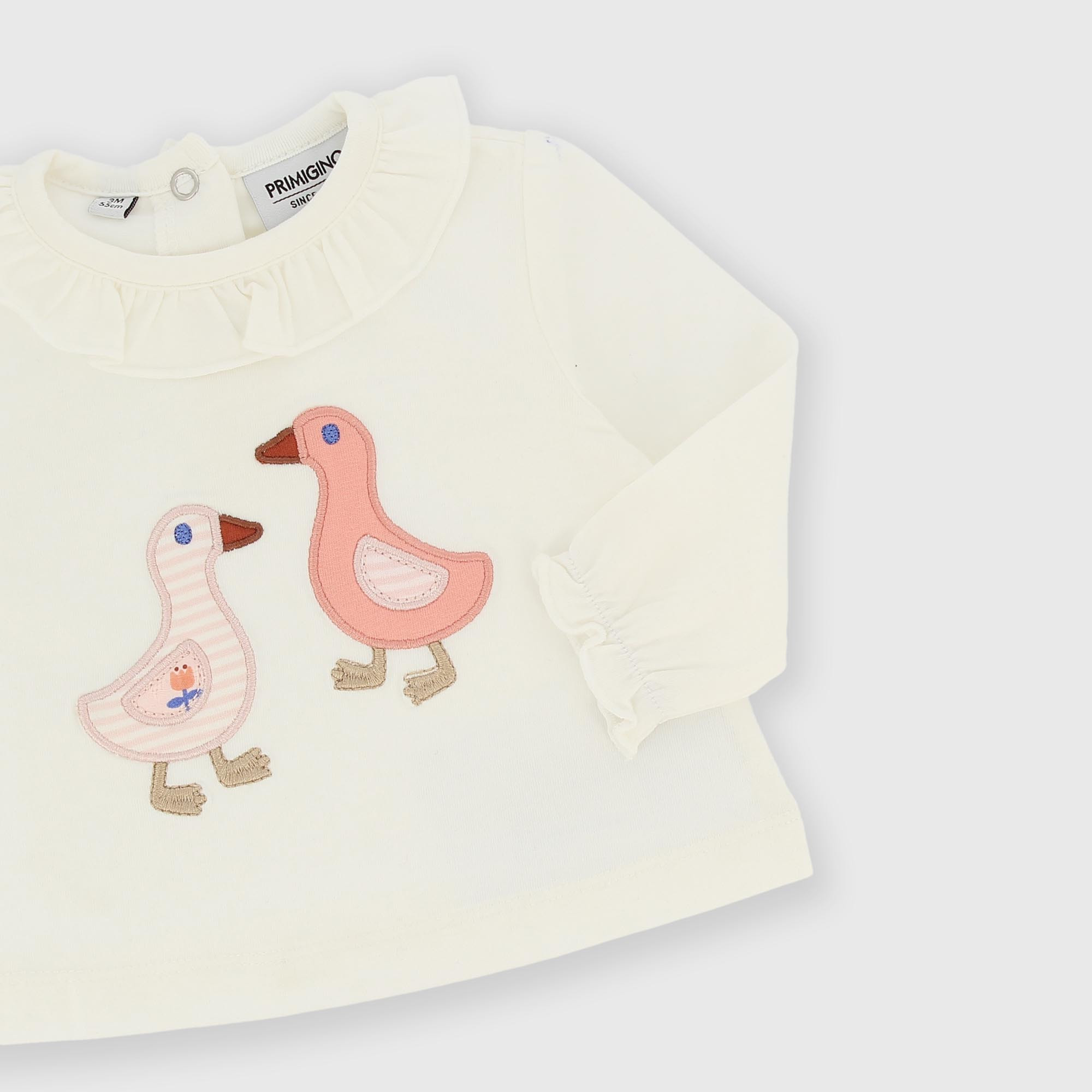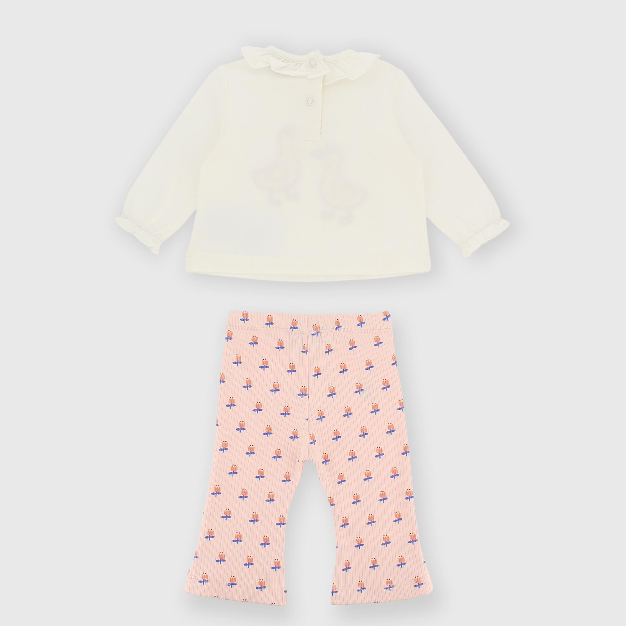 Комплект из двух предметов. Футболка из джерси, круглый вырез горловины, длинные рукава. Застёжка на кнопку сзади. Оборки на горловине. Вышитые аппликации спереди. Расклешенные брюки в рубчик с цветочным принтом по всей поверхности и эластичным поясом.