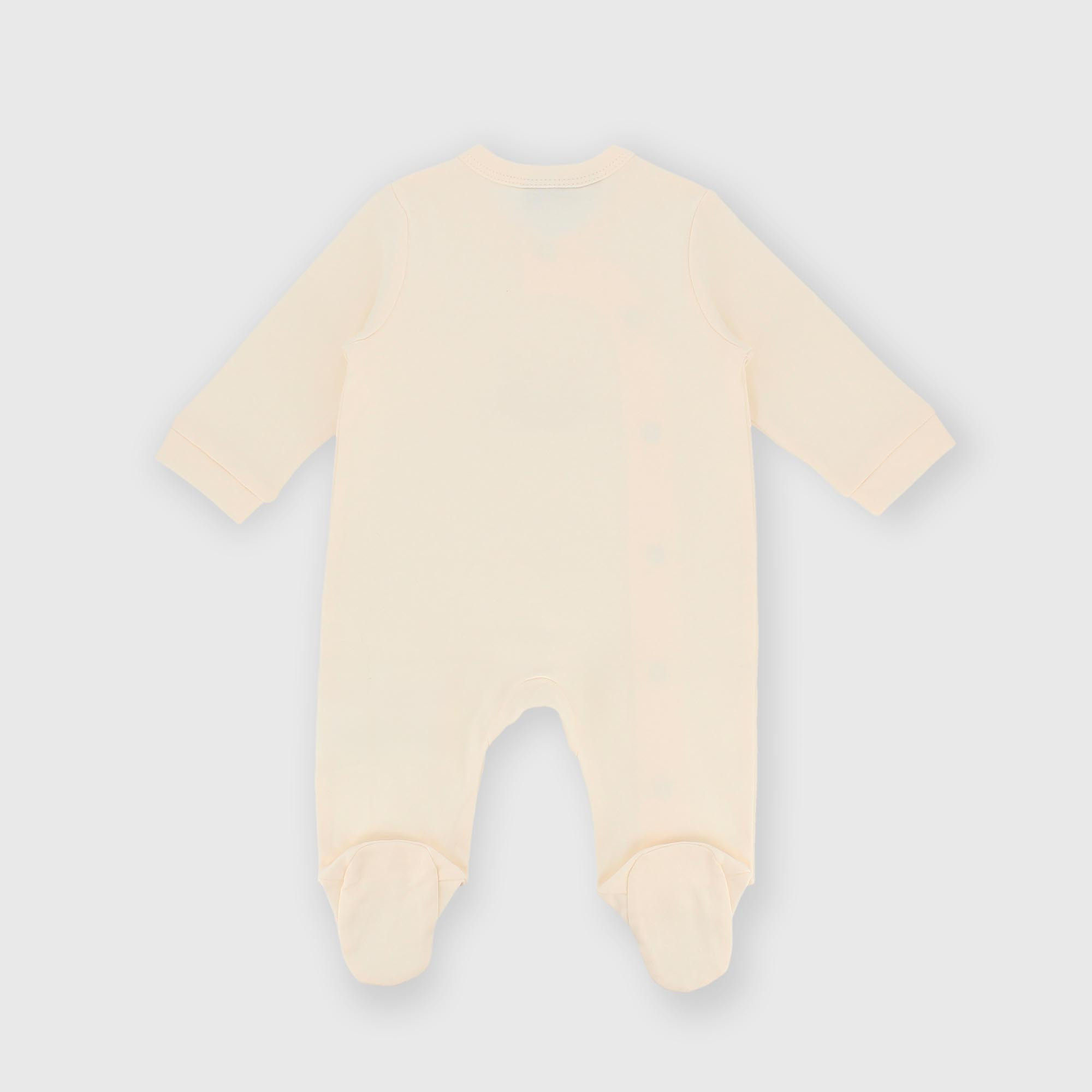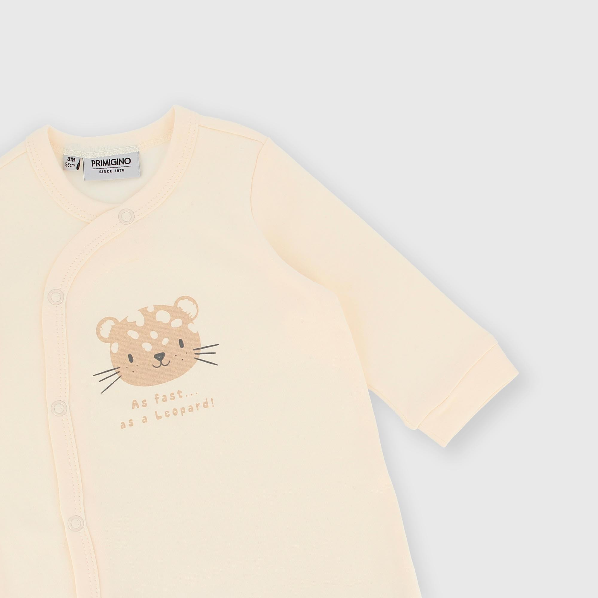 Комбинезон интерлок с круглым вырезом и длинными рукавами. Застёжка в стиле кимоно на кнопки. Принт спереди.