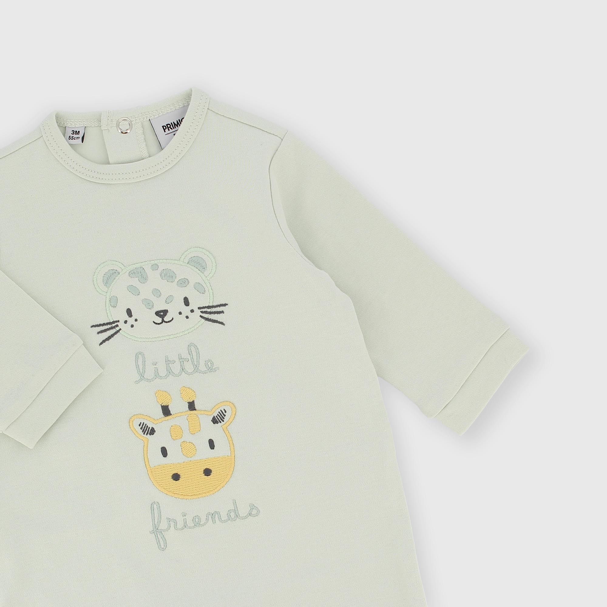 Комбинезон интерлок с круглым вырезом и длинными рукавами. Застёжка на кнопки сзади. Вышитые аппликации с животными спереди.