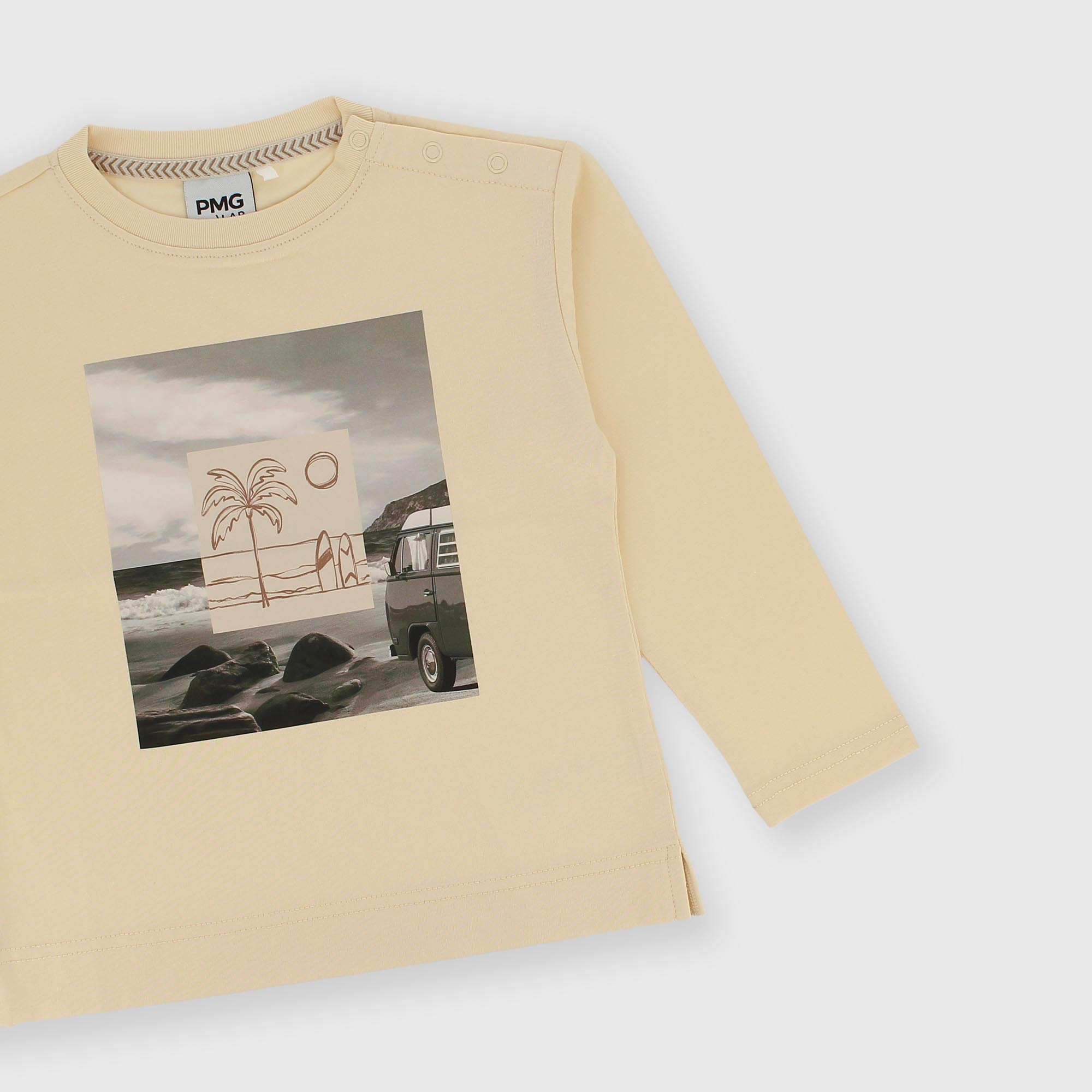 Футболка из джерси, круглый вырез горловины, длинные рукава. Застёжка на кнопки на плече. Принт спереди. Разрезы по бокам.