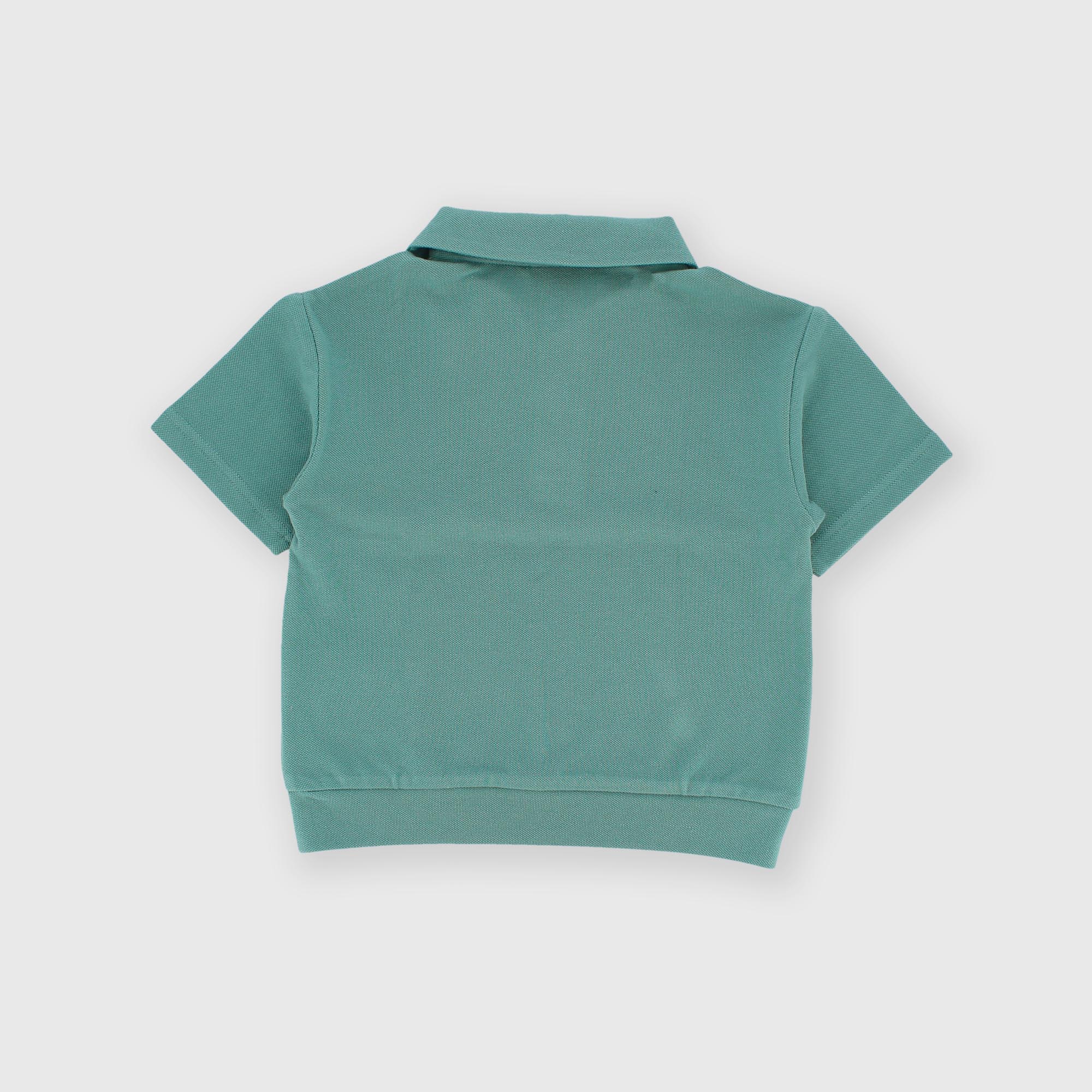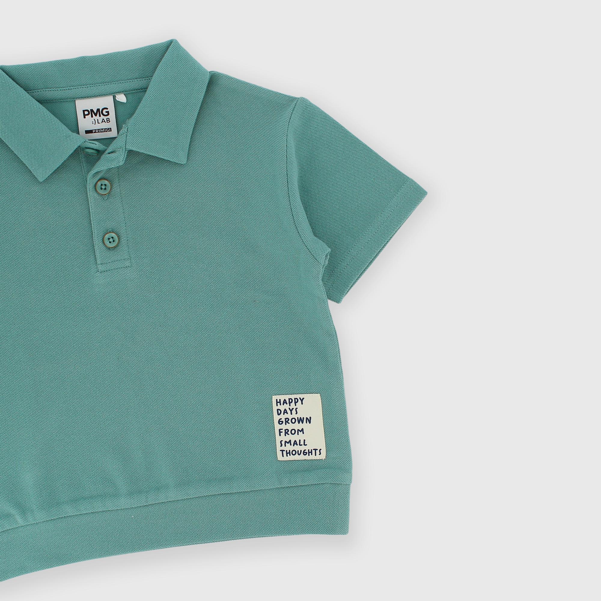 Рубашка-поло из пике с короткими рукавами. Застёжка на пуговицы спереди. Небольшая нашивка спереди.