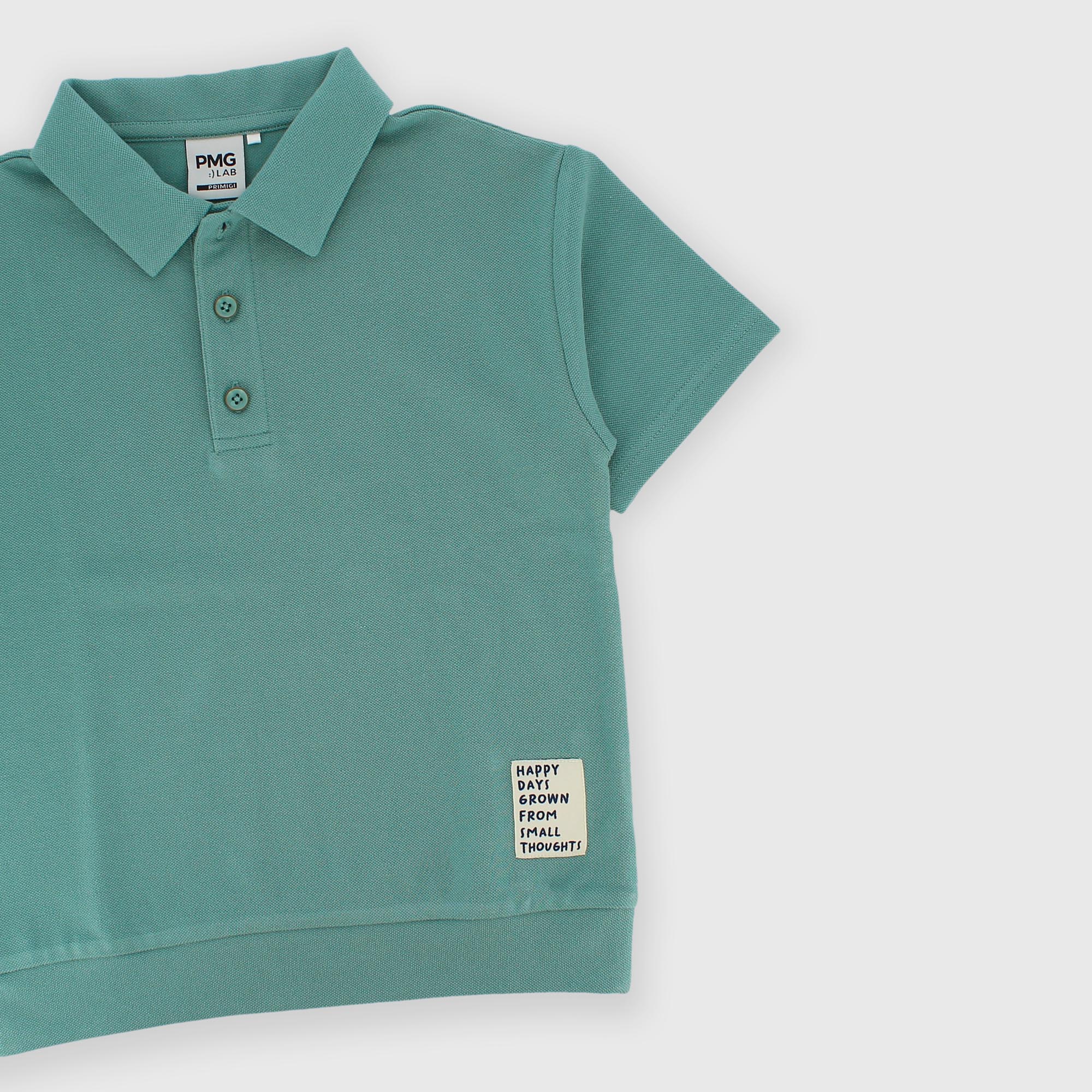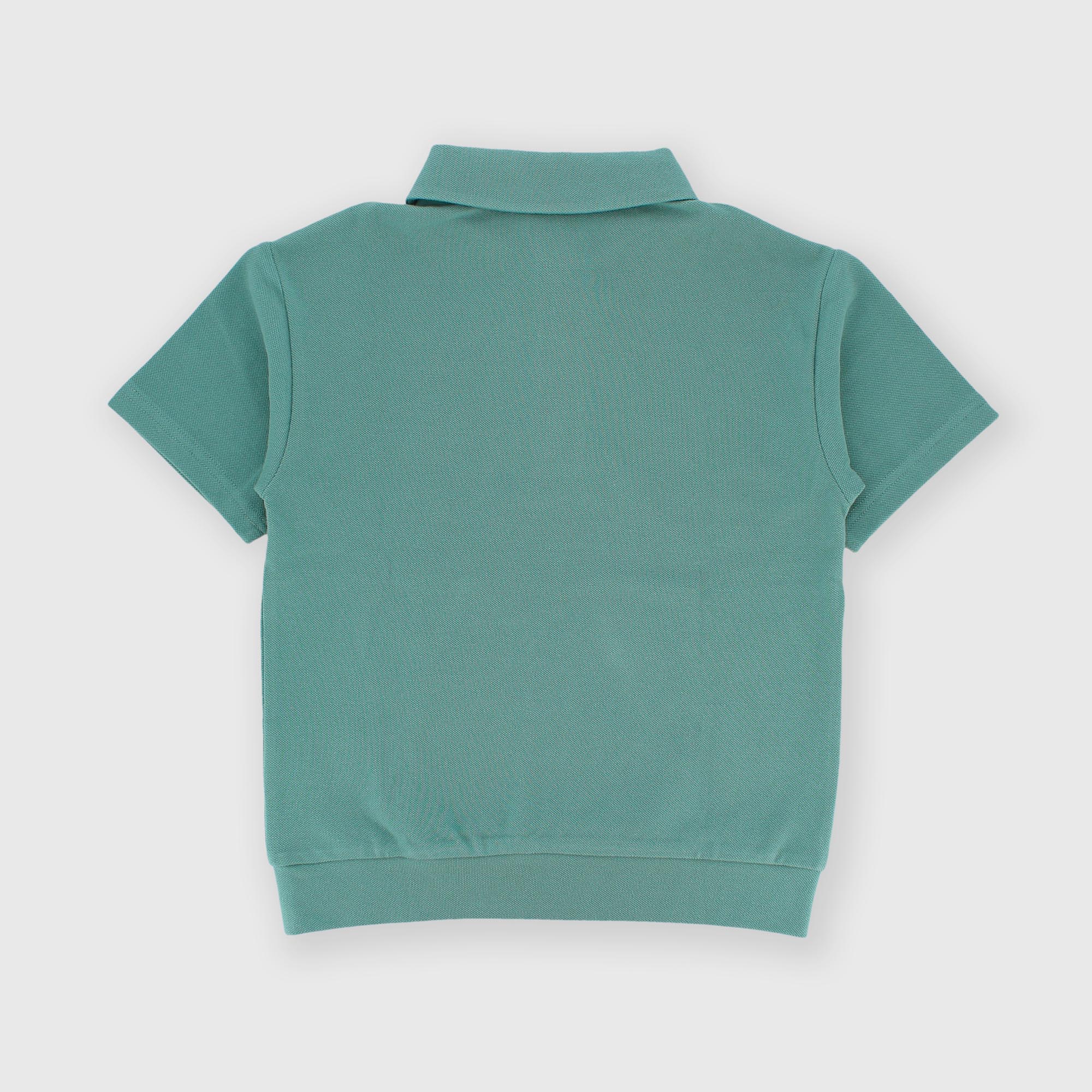 Рубашка-поло из пике с короткими рукавами. Застёжка на пуговицы спереди. Небольшая нашивка спереди.