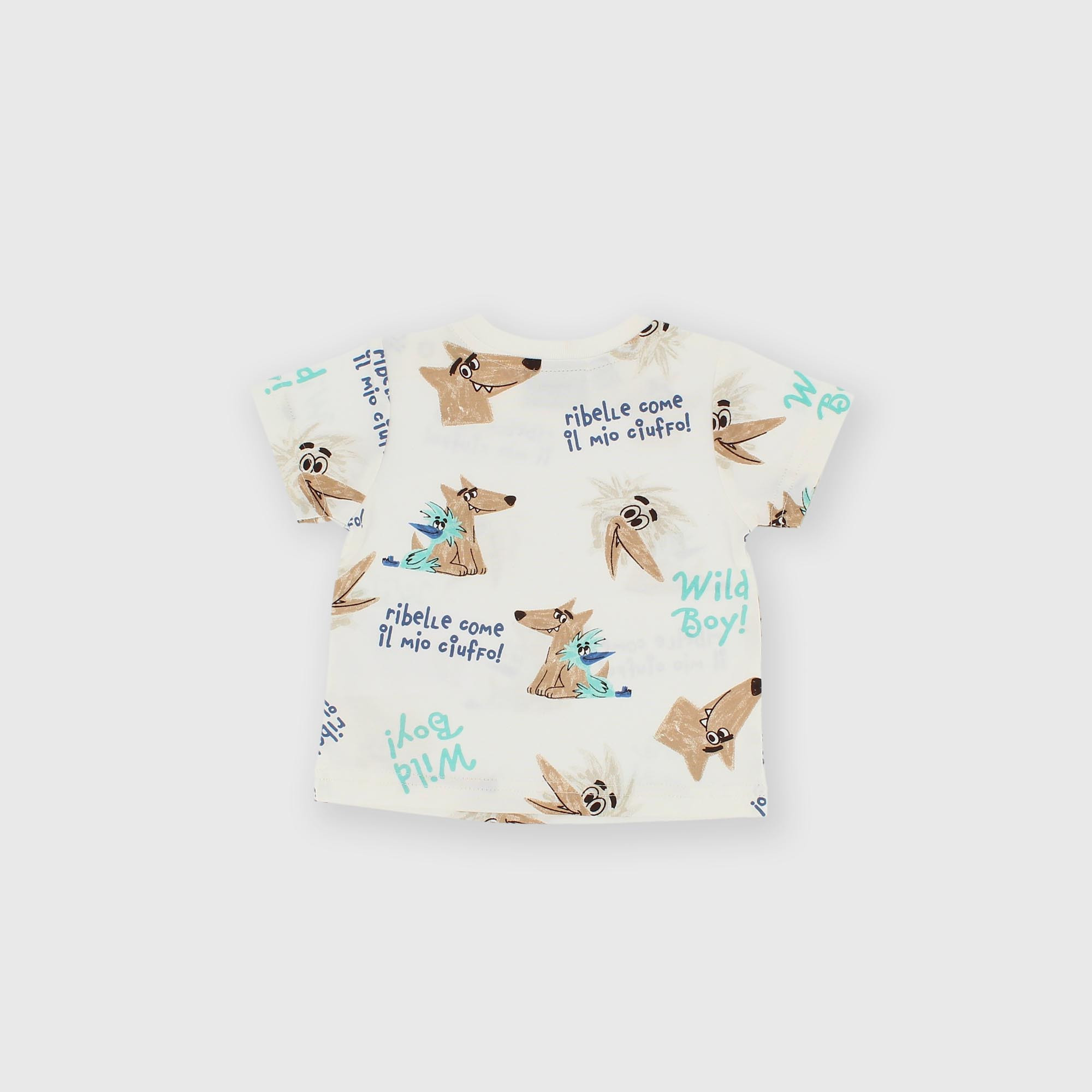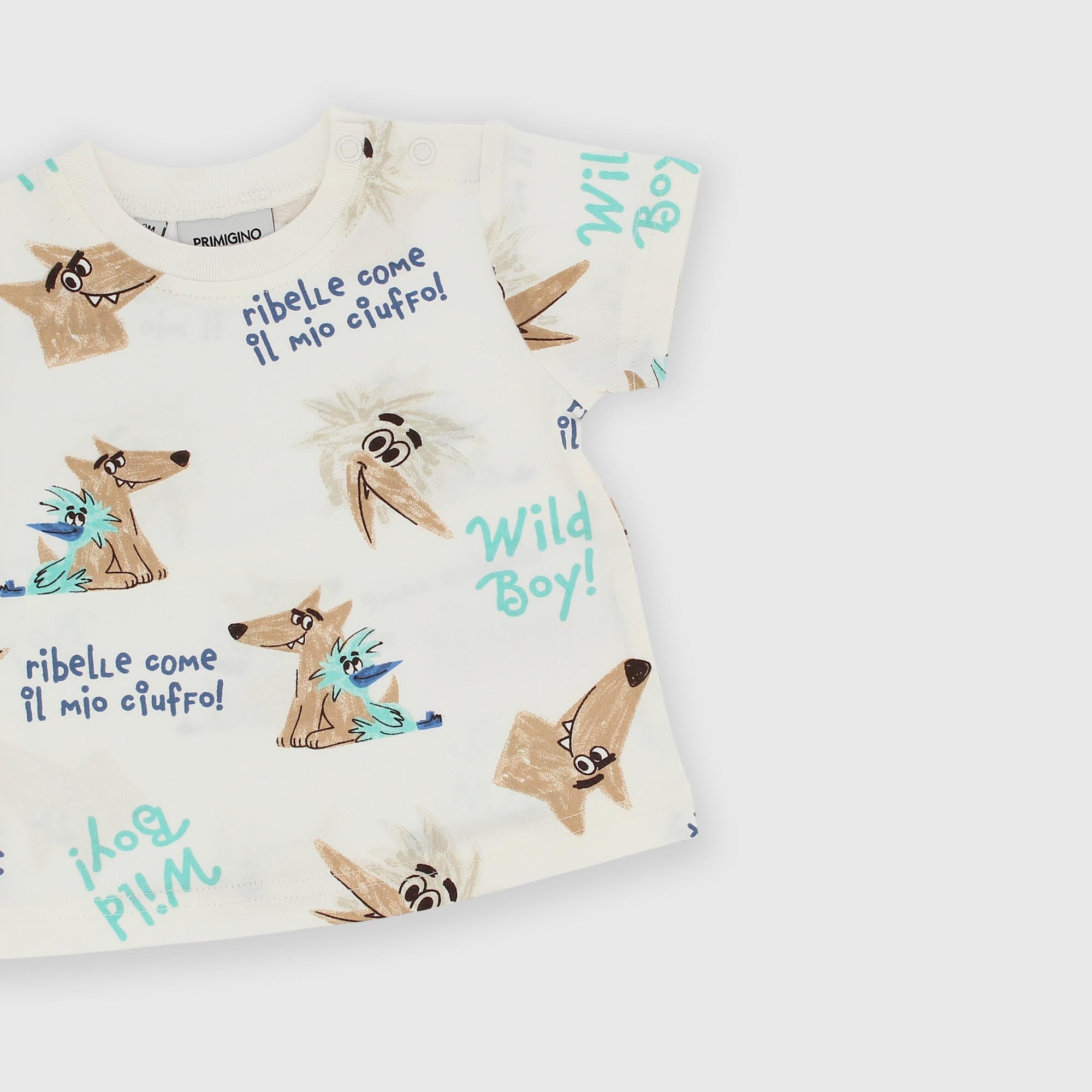 Футболка из джерси, круглый вырез горловины, короткие рукава. Застёжка на кнопку на плече. Анималистичный принт по всей поверхности.