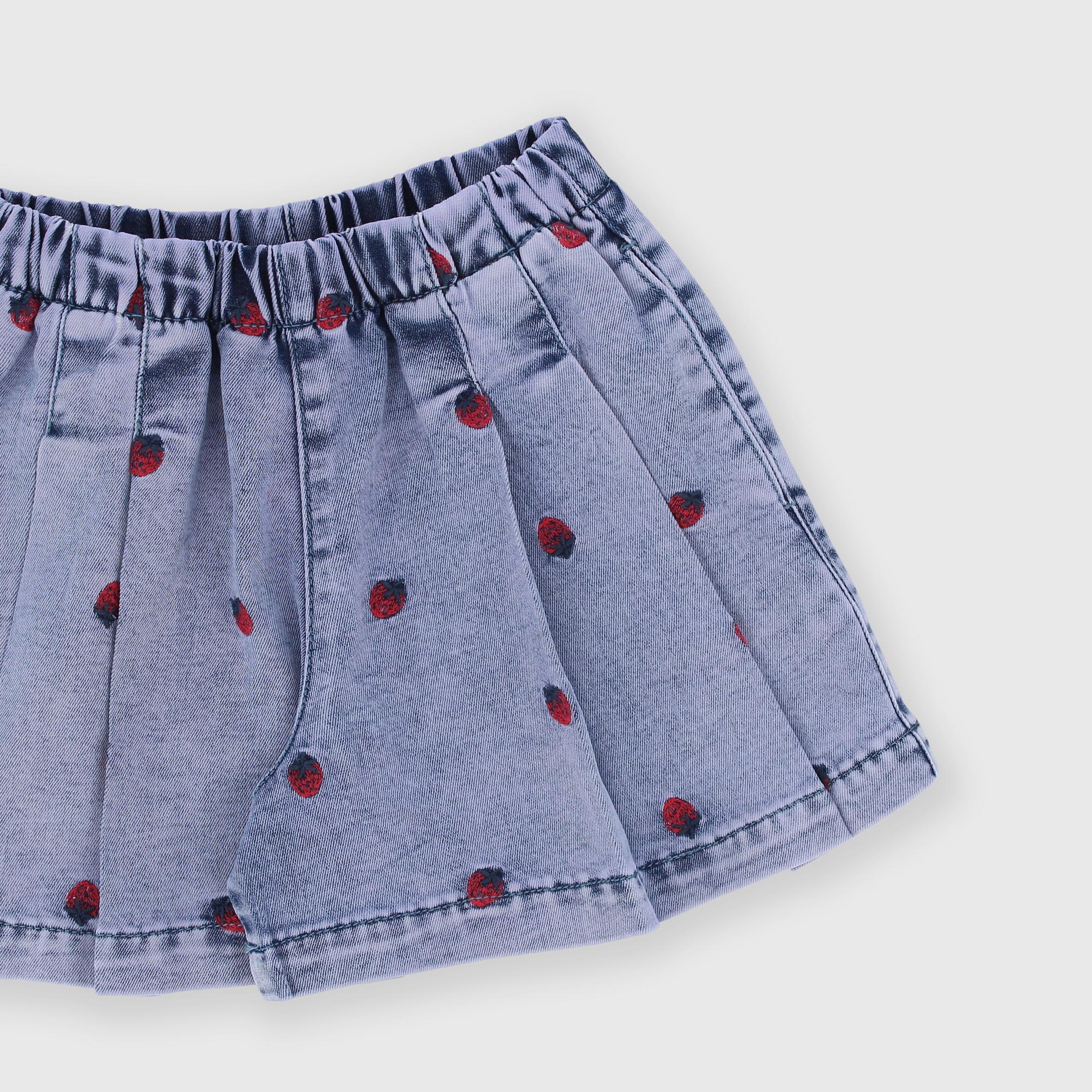 Джинсовые шорты с эластичной талией. Врезные боковые карманы. Вытачки спереди. Вышивка в виде клубники.