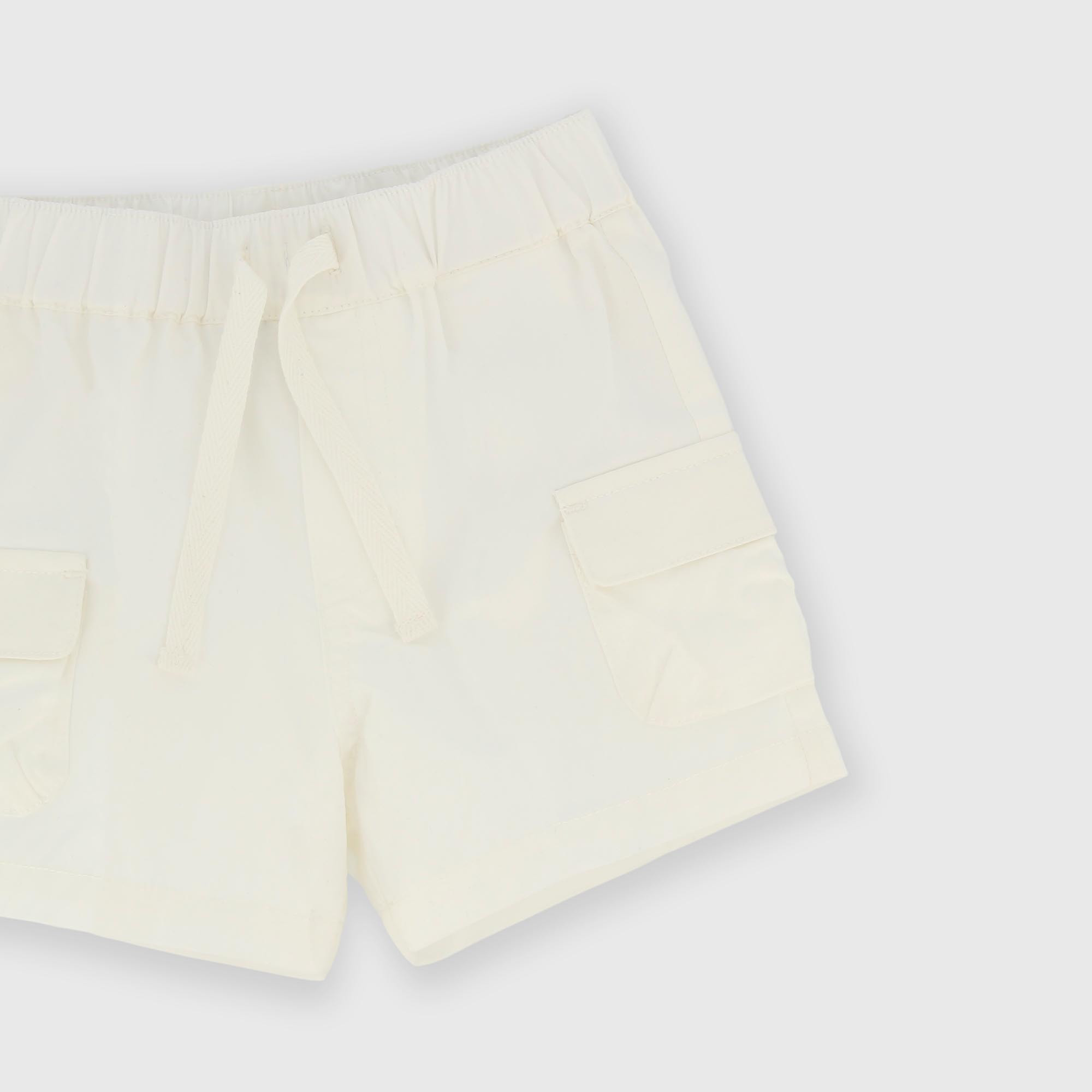 Шорты из поплина с эластичной талией и шнурками спереди. По бокам накладные карманы с клапанами.
