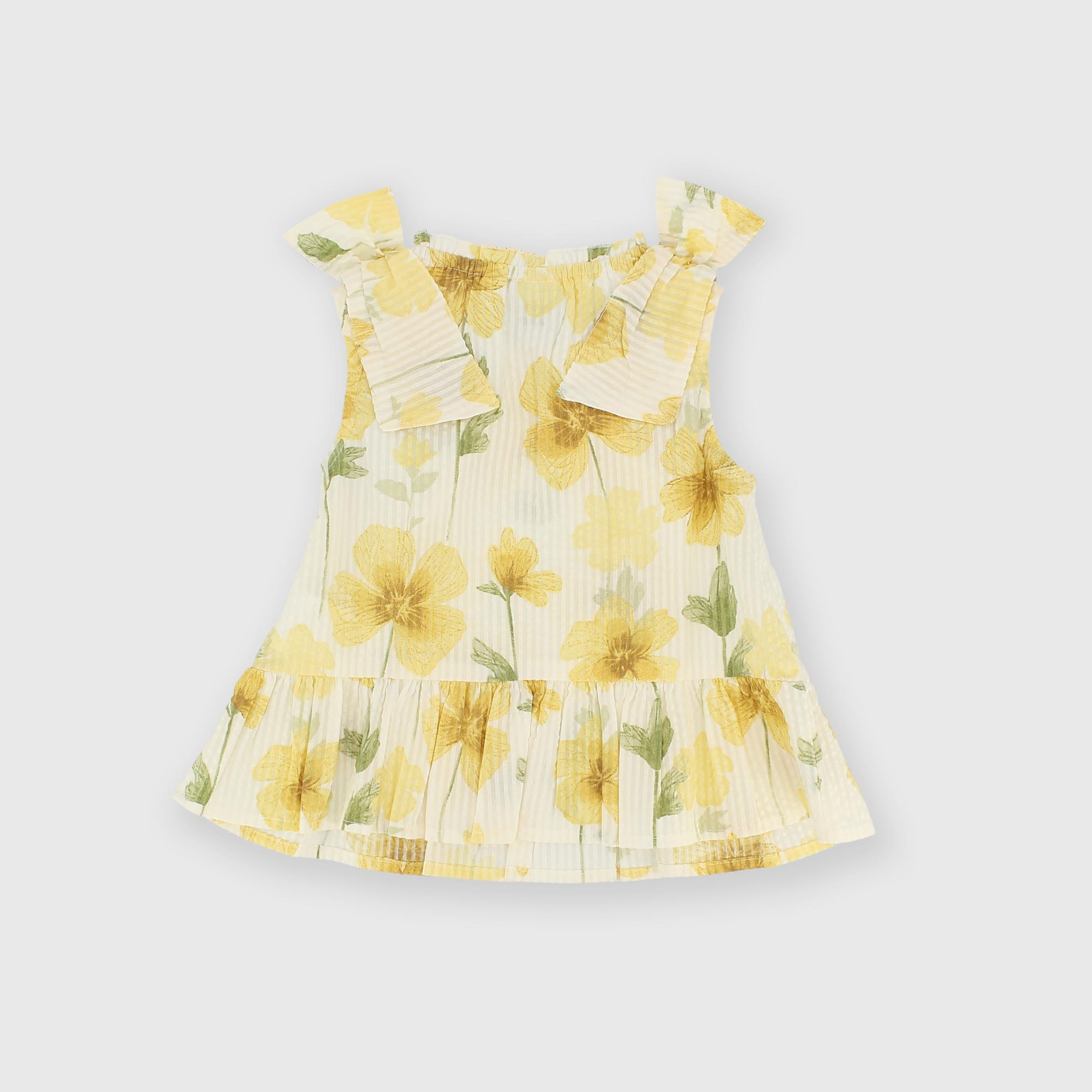 Хлопковый топ с круглым вырезом и проймами. Бантики на плечах. Потайная молния сбоку. Оборка по подолу. Цветочный принт по всей поверхности. Слегка тиснёная отделка.