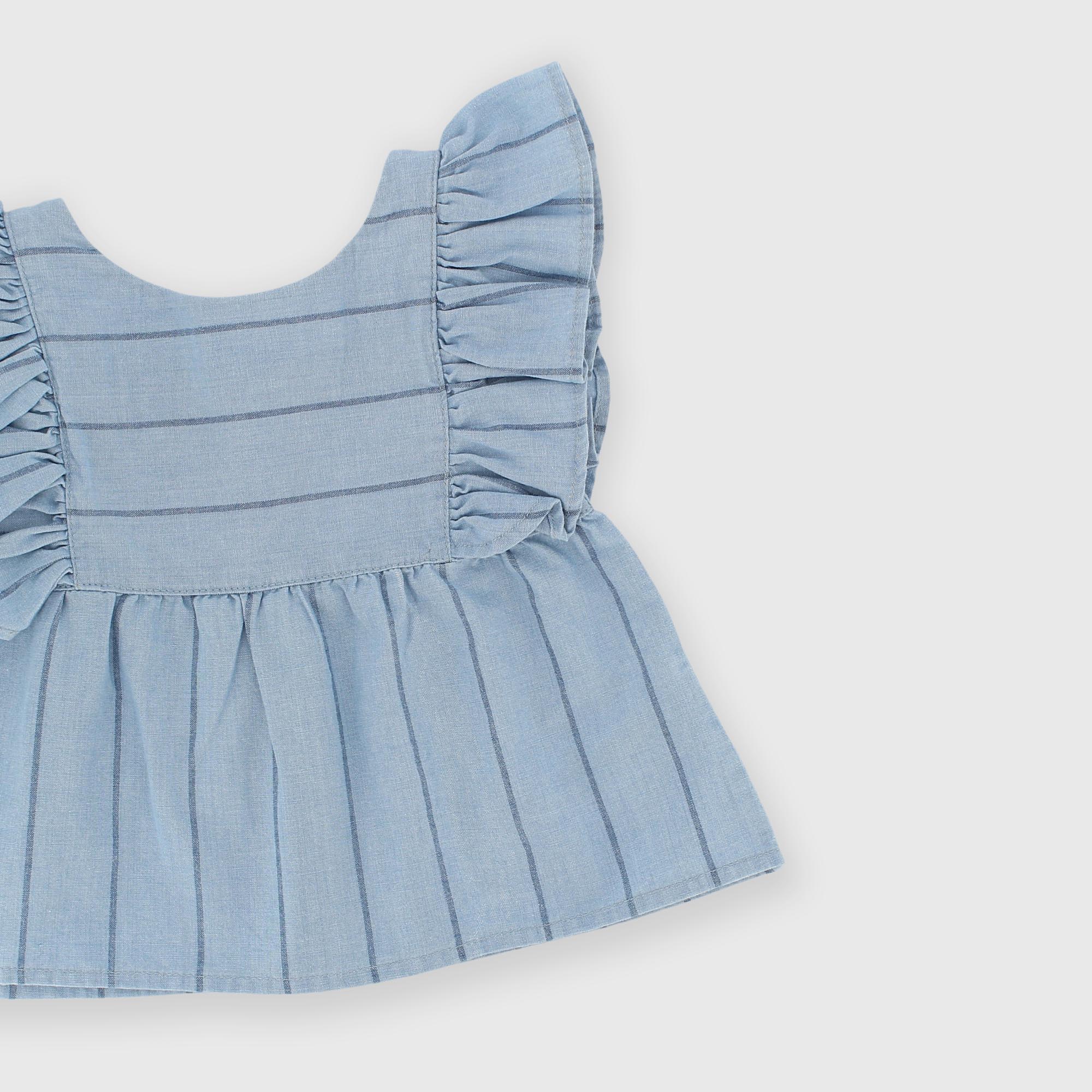 Полосатый топ из шамбре с круглым вырезом. Оборки на плечах. Застёжка на пуговицы сзади.