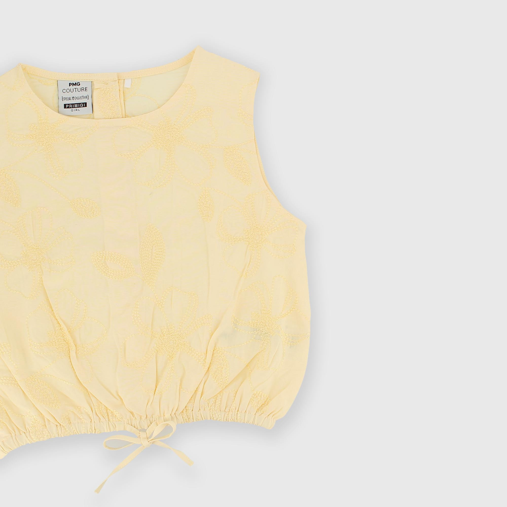 Топ из вышитого хлопка с круглым вырезом и проймами. Застёжка-капелька с небольшой пуговицей сзади. Эластичный подол с аппликацией-бантом.