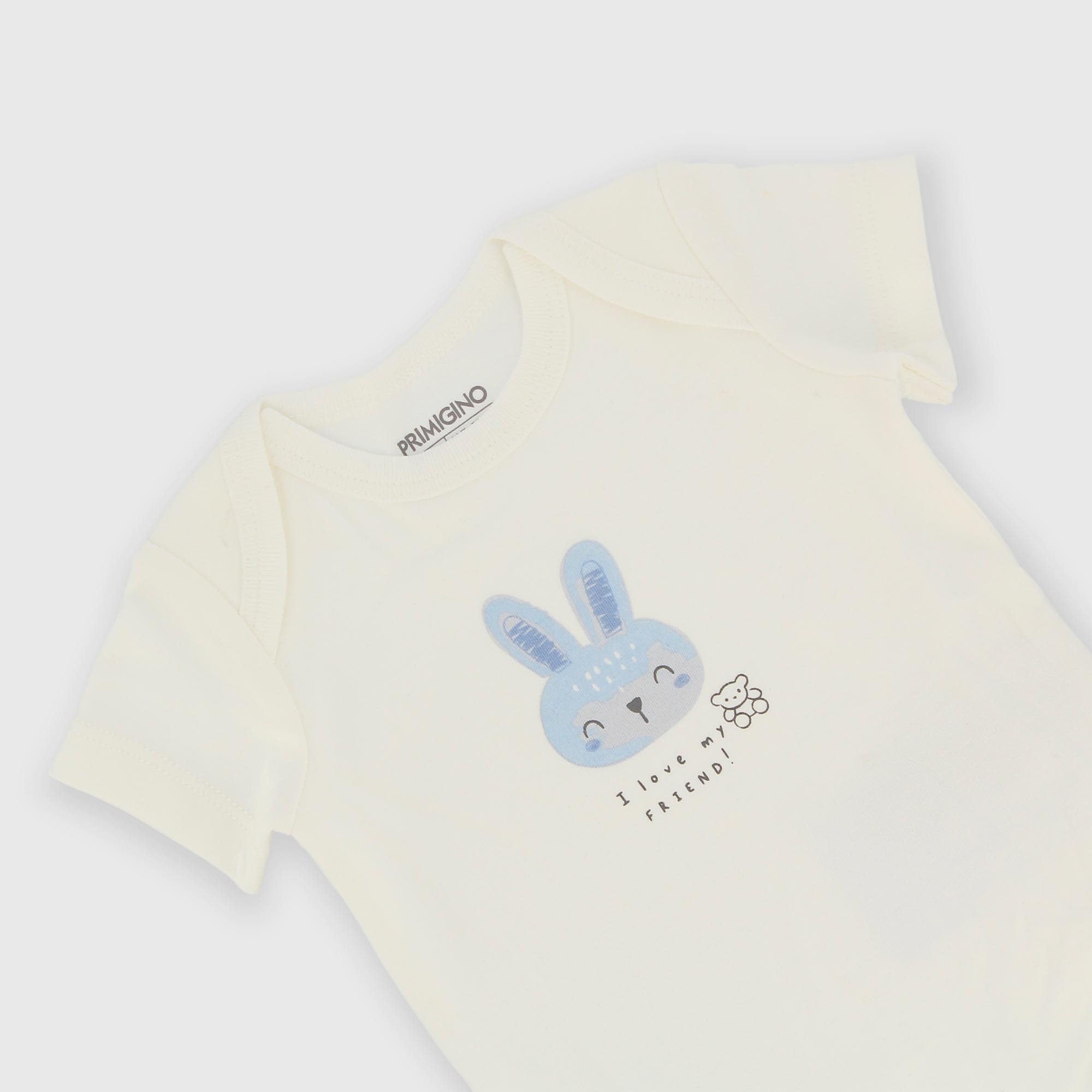 Боди интерлок с круглым вырезом и короткими рукавами. Застежка на кнопки внизу. Принт спереди.