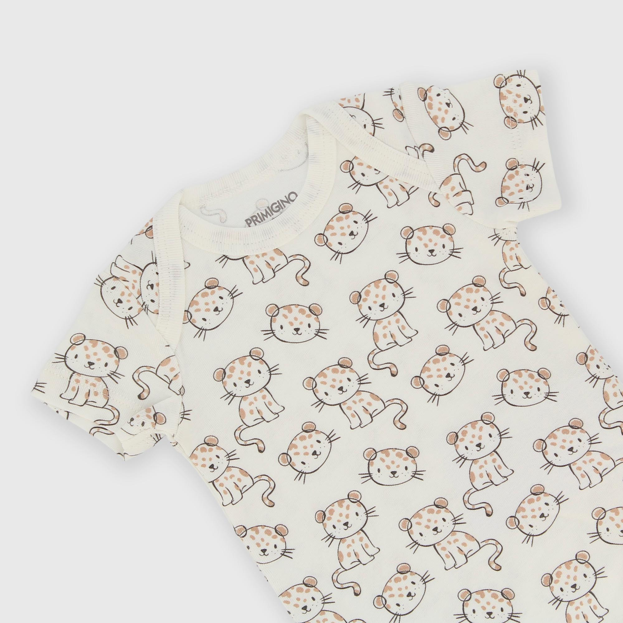Боди в рубчик с круглым вырезом и короткими рукавами. Застежка на кнопки внизу. Сплошной принт.