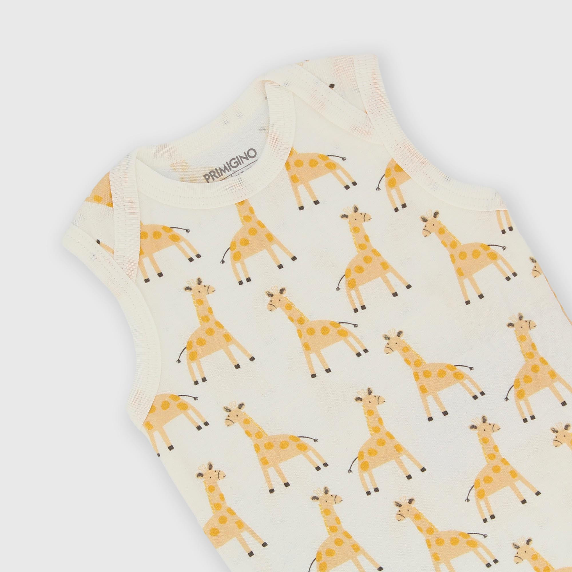 Боди с круглым вырезом и проймами. Застёжка на кнопки снизу. Сплошной принт.