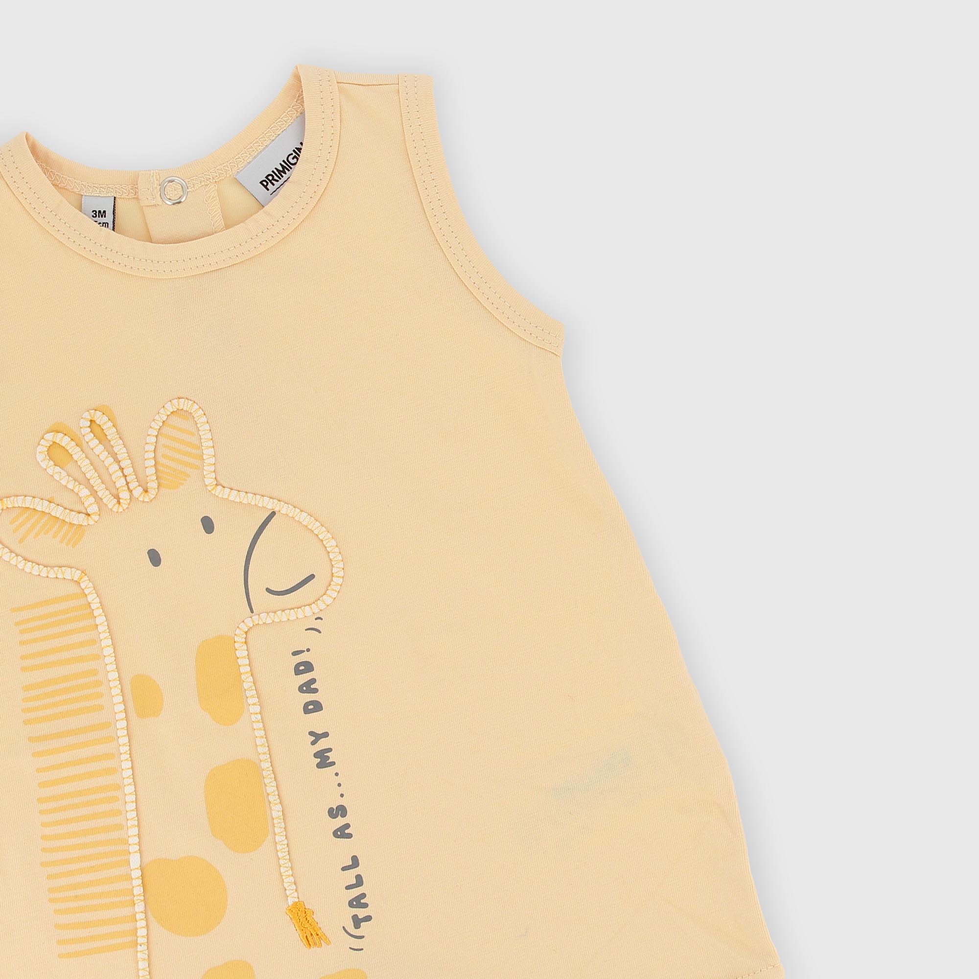 Трикотажный комбинезон с круглым вырезом и без рукавов. Застёжка на кнопки сзади и в области паха. Принт жирафа спереди.