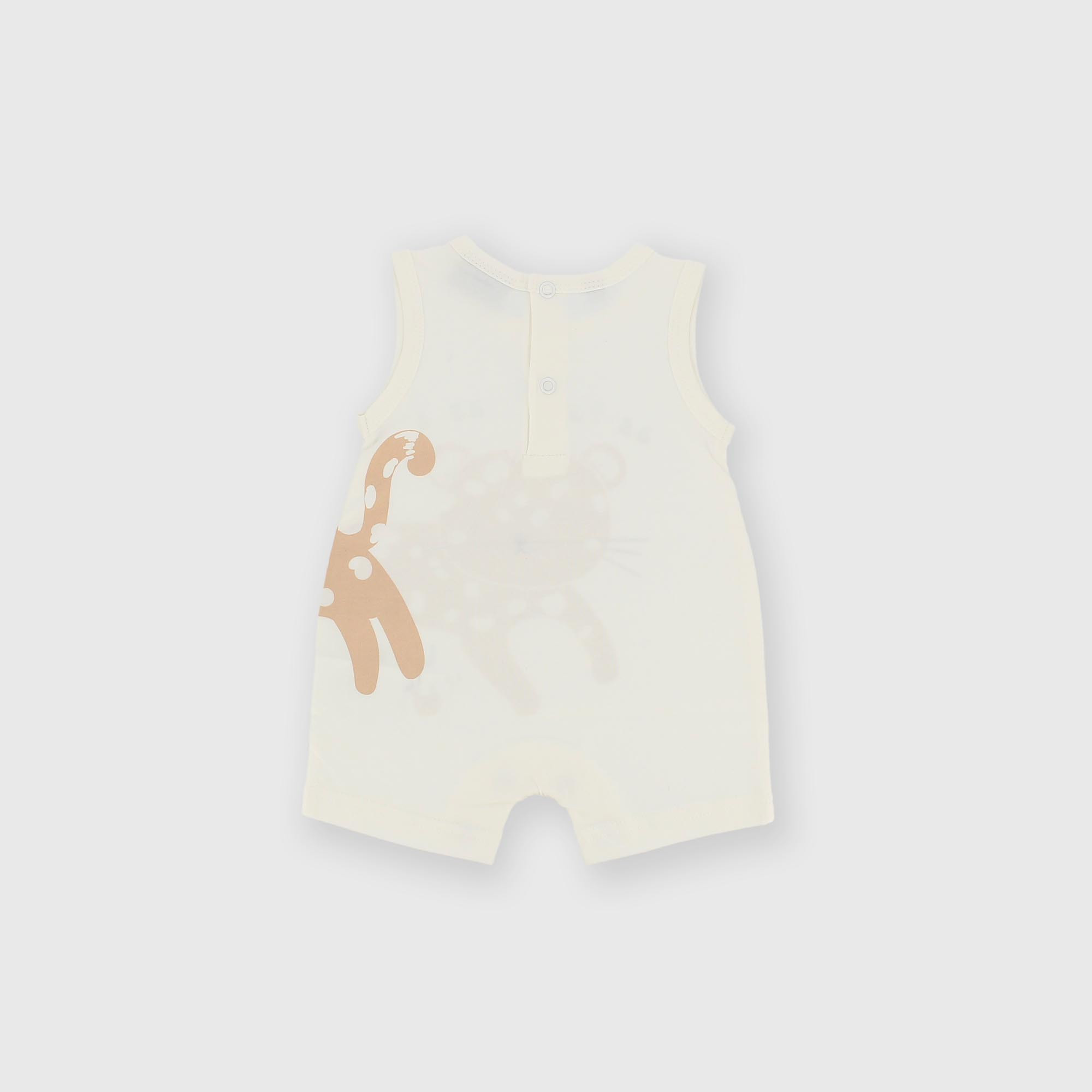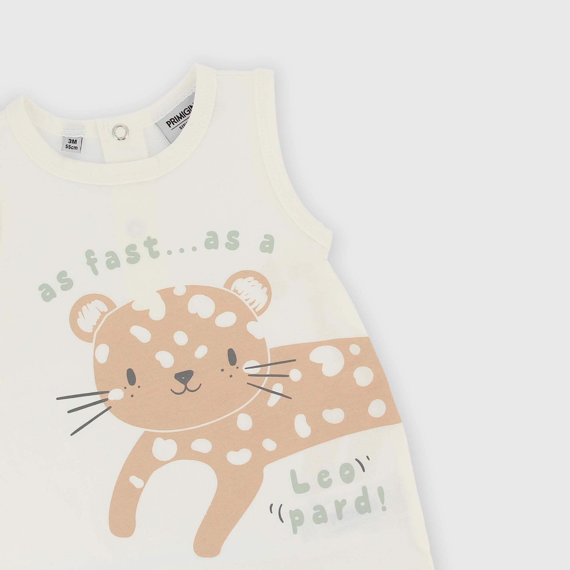 Трикотажный комбинезон с круглым вырезом и без рукавов. Застёжка на кнопки сзади и в области паха. Леопардовый принт спереди.