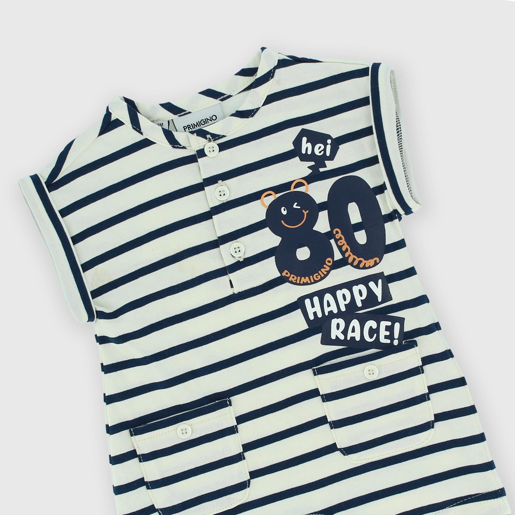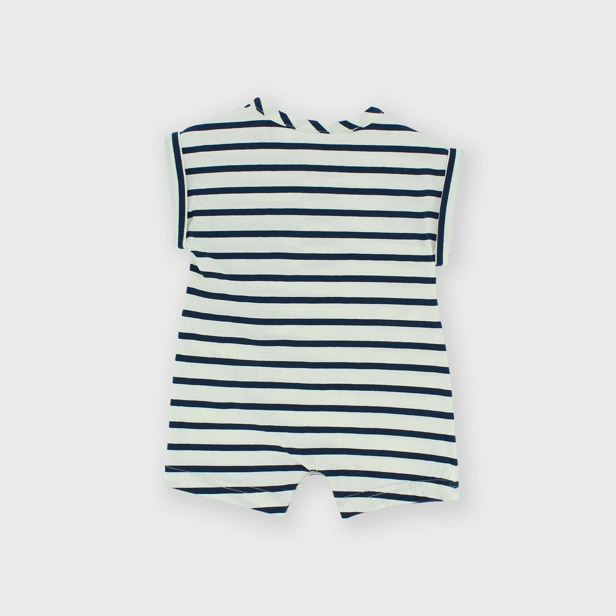 Полосатый комбинезон из джерси, окрашенный в пряже, с круглым вырезом и короткими рукавами. Пуговицы спереди и застежка на кнопки в области промежности. Передний принт. Передние накладные карманы.