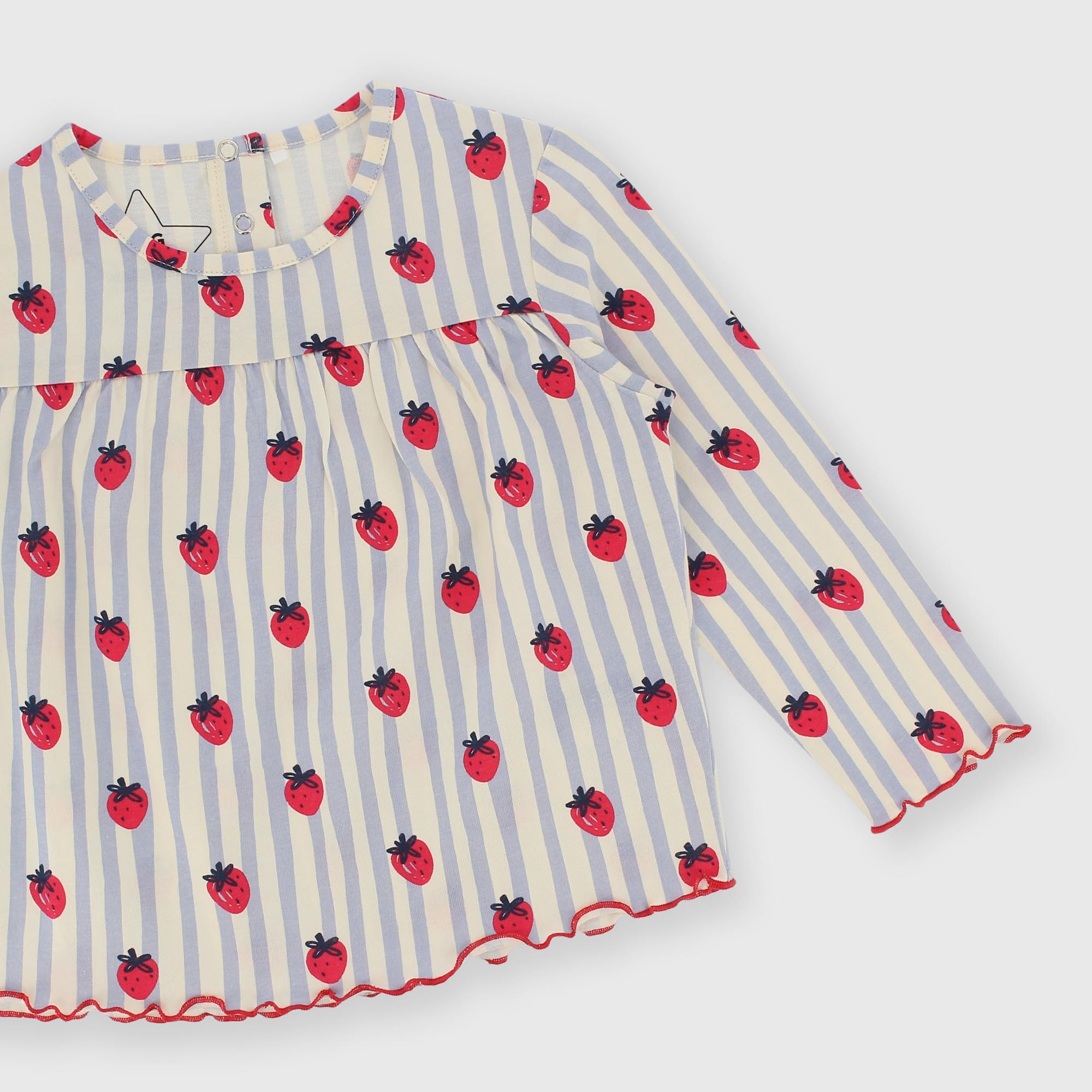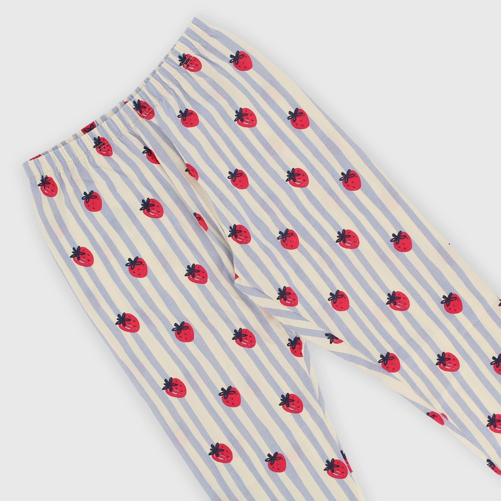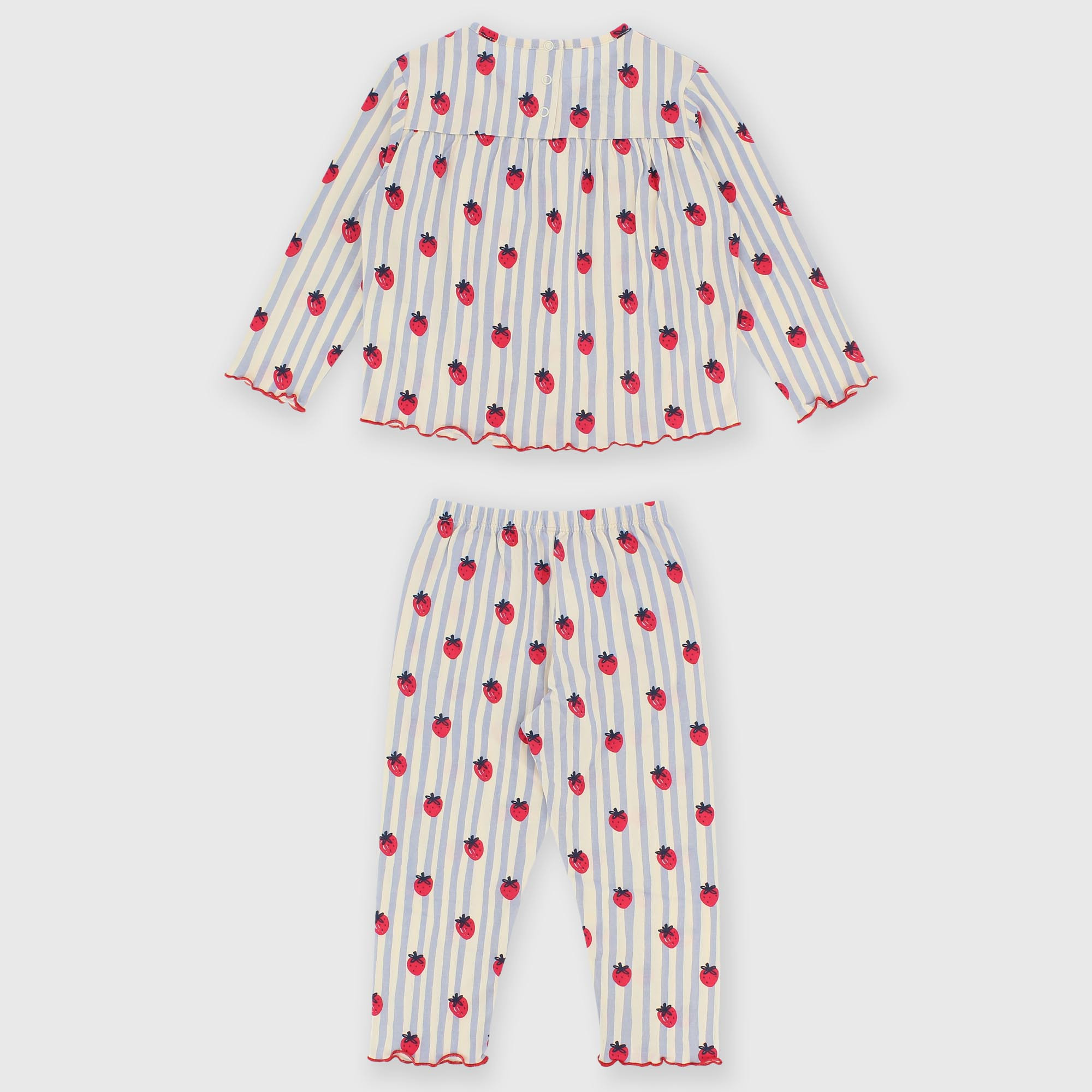 Пижамный комплект из джерси с полосатым принтом и клубникой по всей поверхности. Футболка с круглым вырезом и длинными рукавами. Застёжка на кнопки сзади. Эластичный пояс с отделкой в виде кукольного шва.