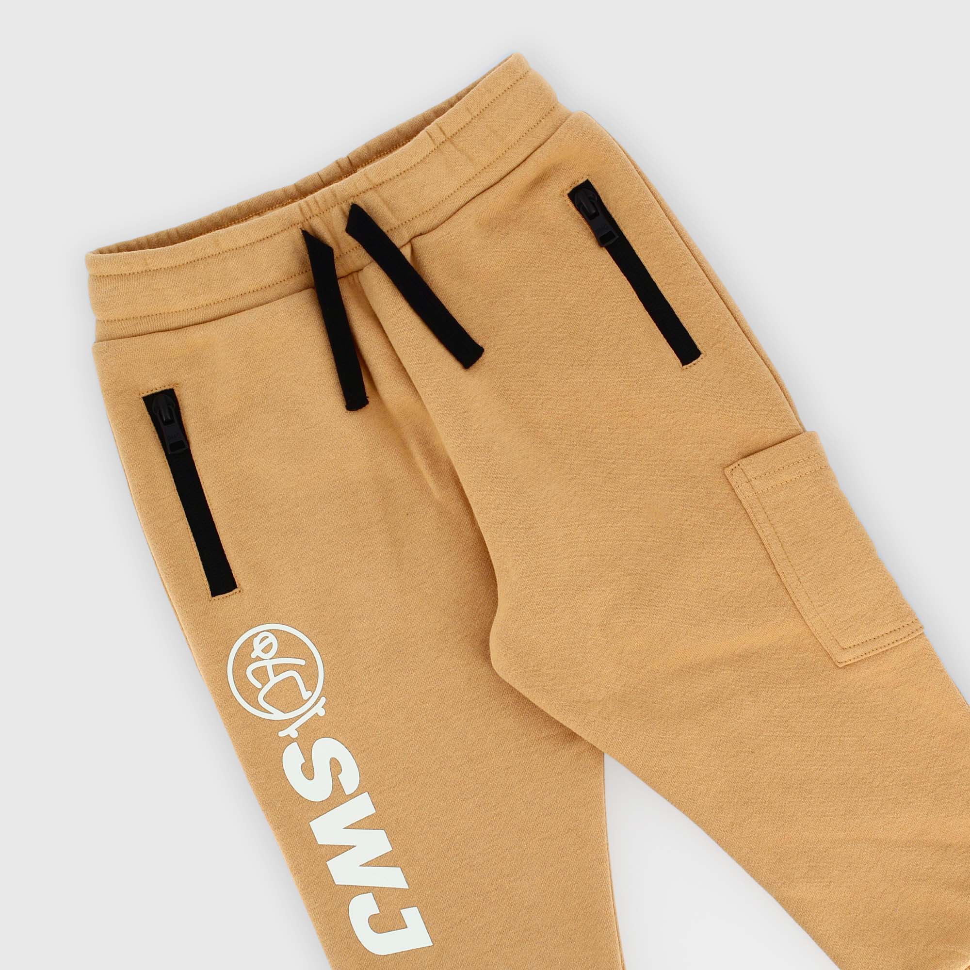 Флисовые брюки с мягкой начесом внутри. Эластичный пояс и шнурки спереди. Передние карманы на молнии и накладные карманы по бокам. Прорезиненный принт. Ребристый низ. Контрастные детали.