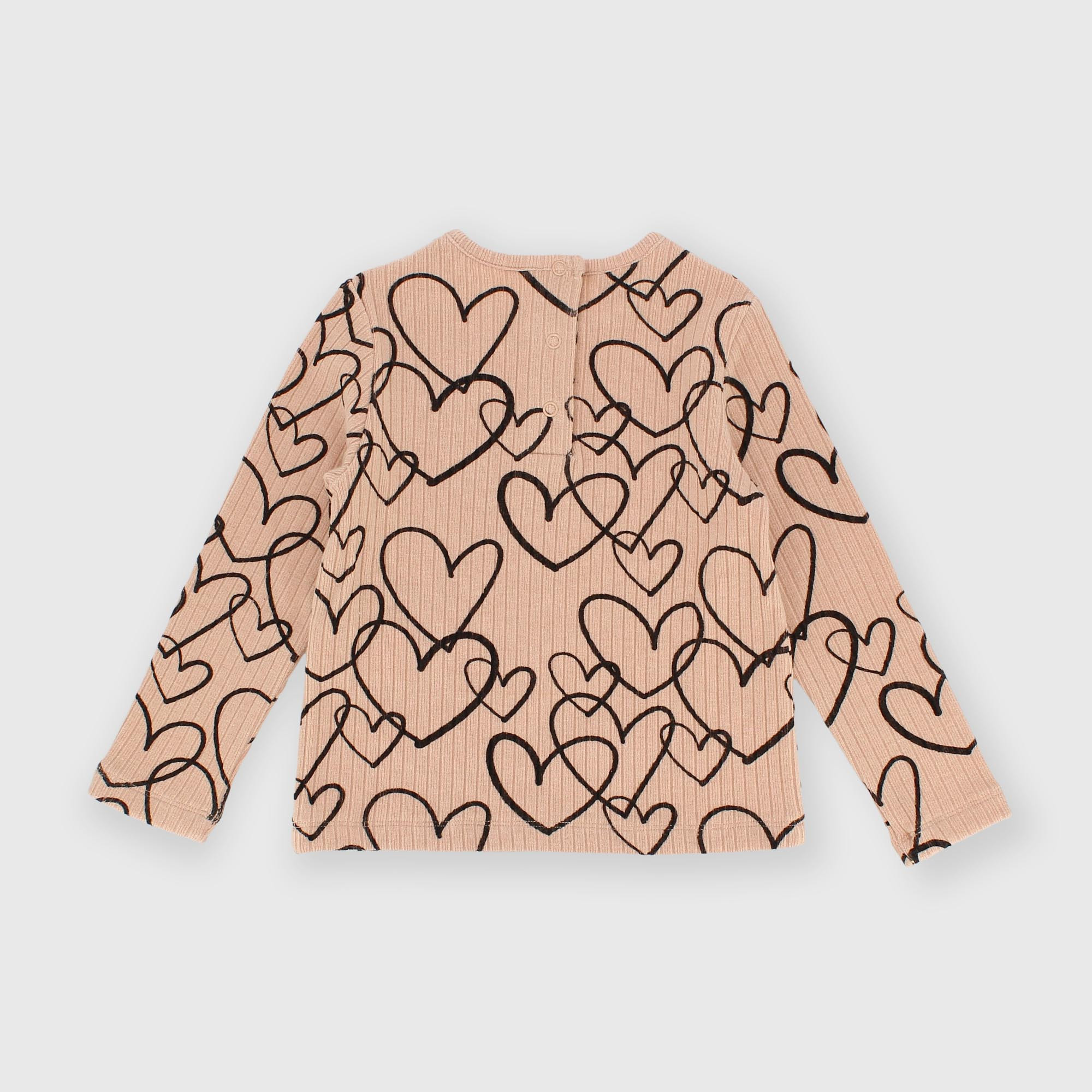 Мягкая на ощупь футболка в рубчик, круглый вырез, длинные рукава. Застежка на кнопки сзади. Сплошной принт.