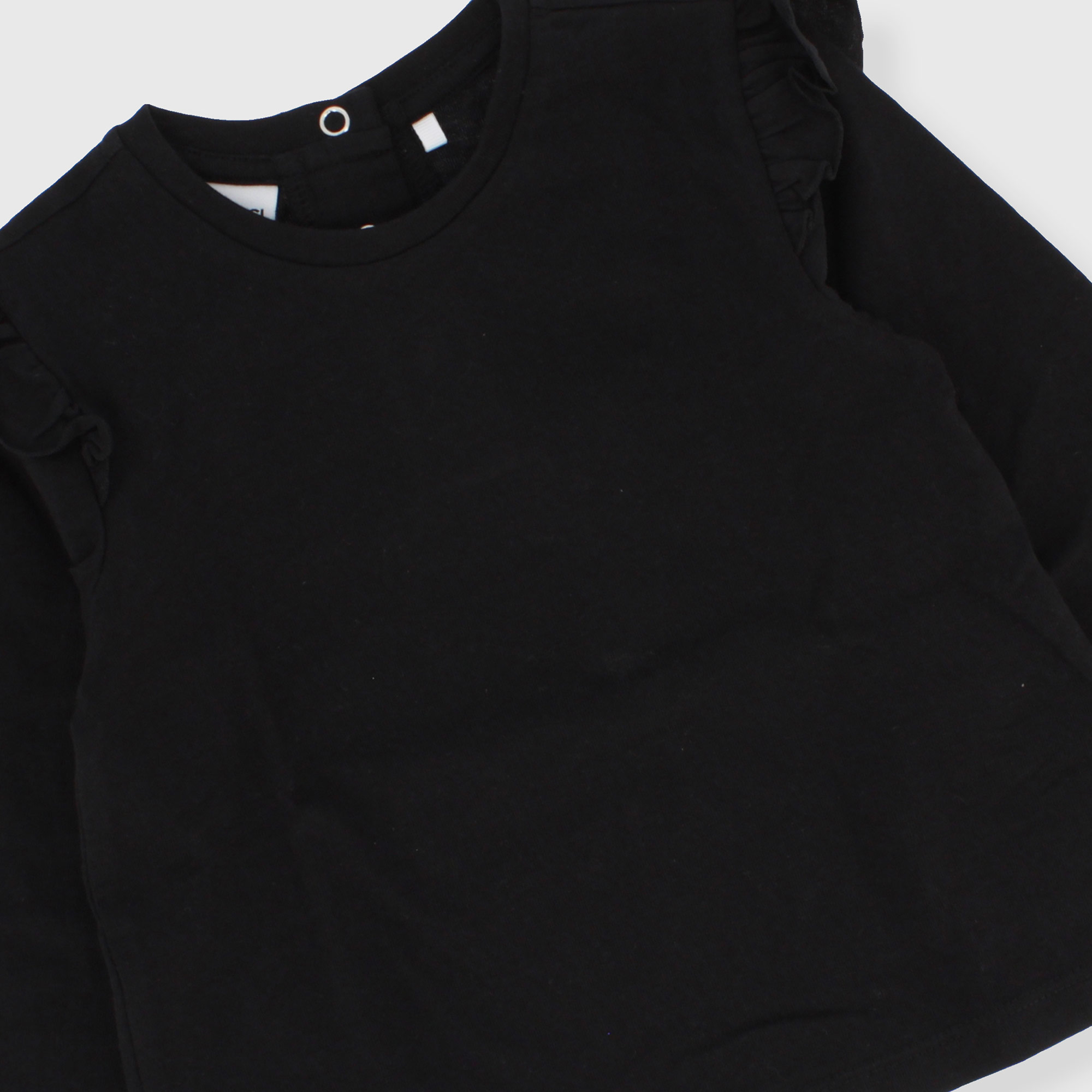 Футболка из джерси, круглый вырез, длинные рукава. Застежка на автоматические кнопки сзади. Оборки на вырезе.